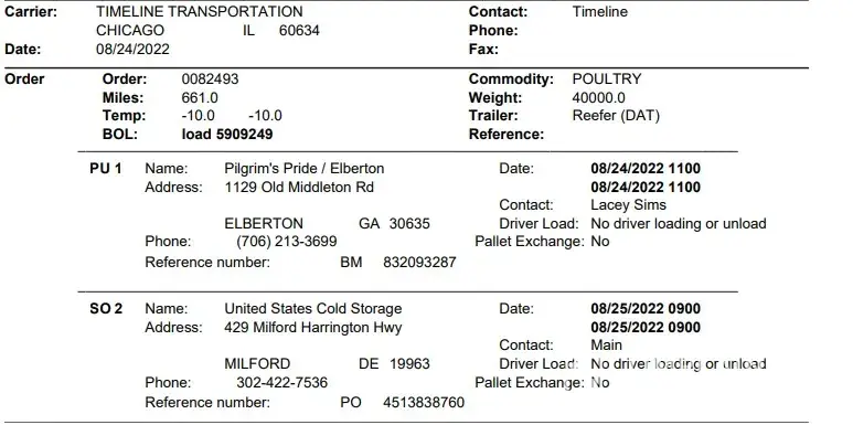 I am a driver for Timeline Transportation. Oleg Zelenski. email: [protected]@gmail.com . Picked up BOL: load 5909249 on August 24. Pilgrim's at ELBERTON GA 30635 . Reference number: BM [protected]