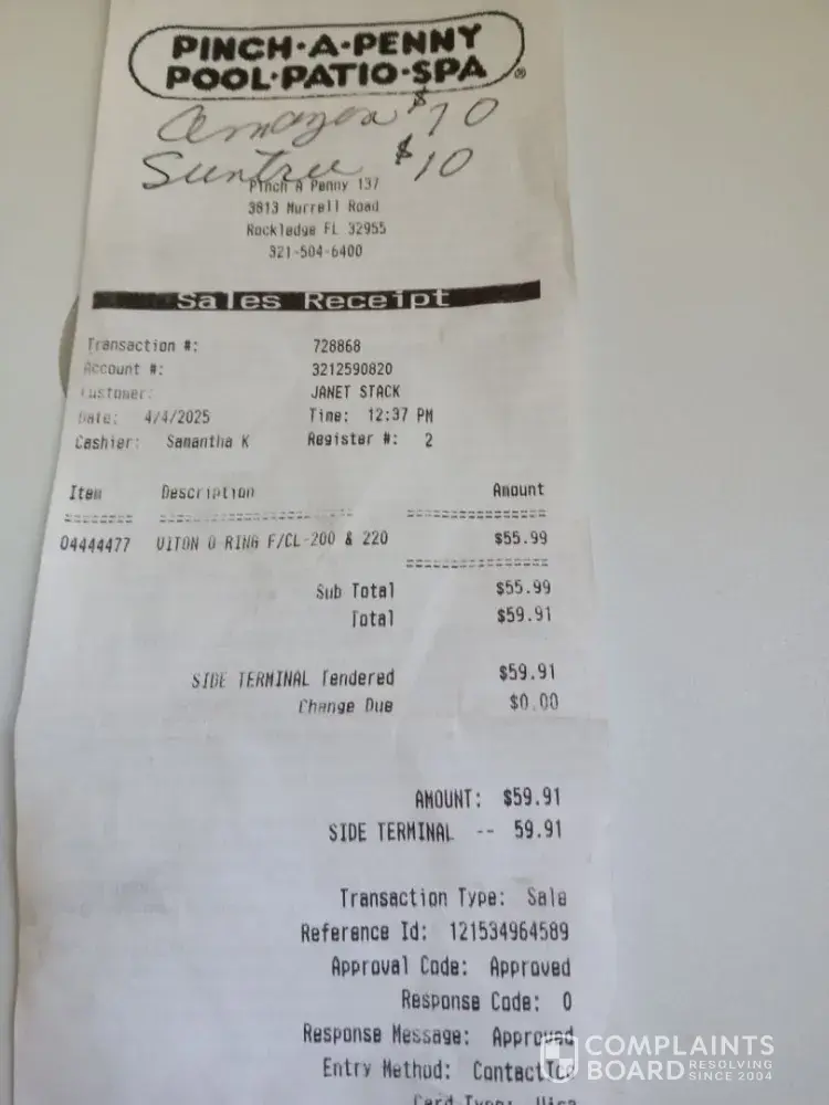 I took chlorinator lid into store #137, rockledge, fl on 4/4/25 and samantha installed a new gasket (viton o ring f/cl 200 & 220) quickly and politely. I took the bill to the checkout and was charged $55.99 plus tax. I quickly said that's very high. Paid the bill and left. After getting home I checked the price of that gasket part on amazon, $ 9;95, I...