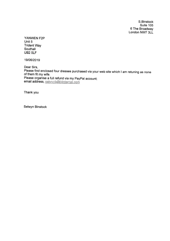 I returned 4 x dresses to YANWEN at Southall address on 19th June 2019