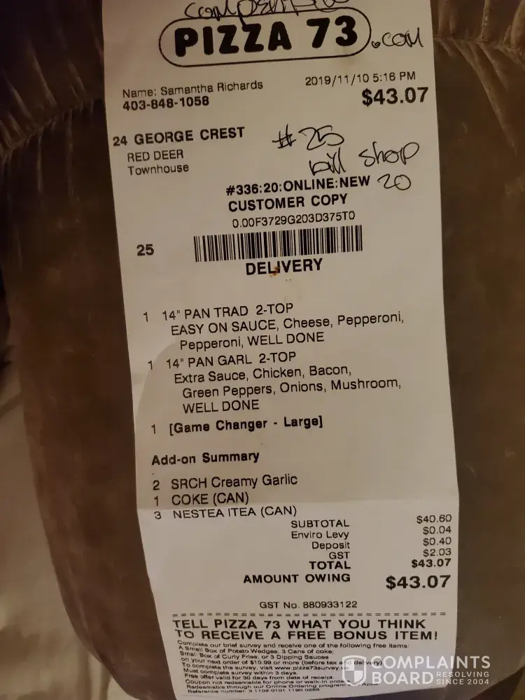 I ordered couple of pizzas the other night from pizza 73, 4912 43 street around 7:30 pm on july 5 2023,#537:21:csc:r4 when the driver delivered my order we had a problem with the debit machine and I was charged twice for the same order.