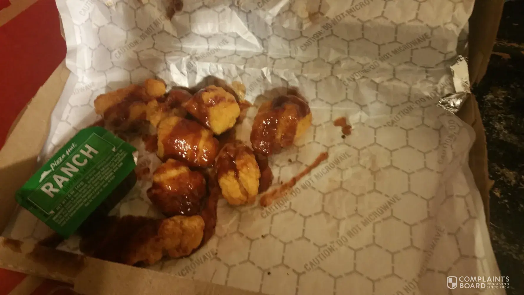 This is a sorry excuse for boneless and for $6.59! Photo attached of the pitiful tiny bites of mostly breading on chicken!