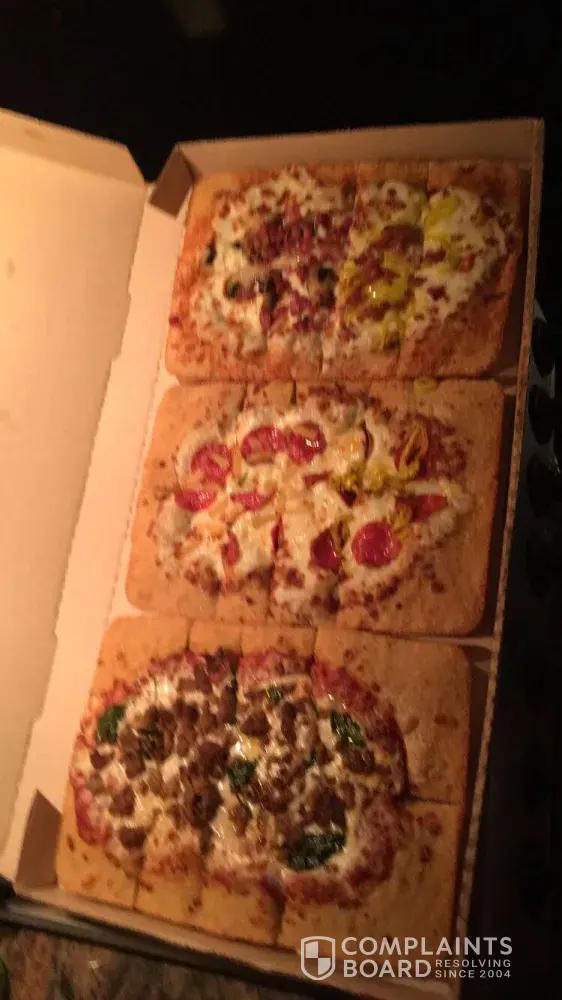 So the first issue which isn't that major is they had no large pizzas, we got 4 mediums instead but who doesnt have a large pizza? But my main issue was the cinnamon bread. (photo) they looked so messy and it looked like whoever made it had no care at all and just slopped on the cinnamon. Also they were so disgusting and did not look appetizing at all and I received no icing which I payed for.