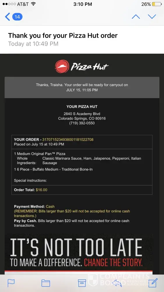 I arrived to pick up my carry out order that I placed online (medium pizza and 6 buffalo wings)at 11:05pm at your south academy location in Colorado Springs and all doors were locked. I attempted calling several times where the line was disconnected while I was on hold waiting for an answer. I knocked on both sets of doors with no answer, even though multiple employees saw and heard me knocking. I called a few more times while standing at the door to this location. I ended up calling your Star Ranch location in Colorado Springs and spoke with Manager Destry. He attempted calling the South academy location as well with no answer as well. Destry did offer me to come to his location but it was not an option for me. After 2 or 3 more call attempts I finally got answer. I was very upset at this point due to the fact I ordered pizza because I had spent the last 5 hours in a emergency vet office for my puppy with a broken leg and didn't have the energy to cook anything, I just wanted to go home. I have never felt so neglected as a customer until now. I try not to complain since I work in customer service but this was simply not something I was willing to ignore.