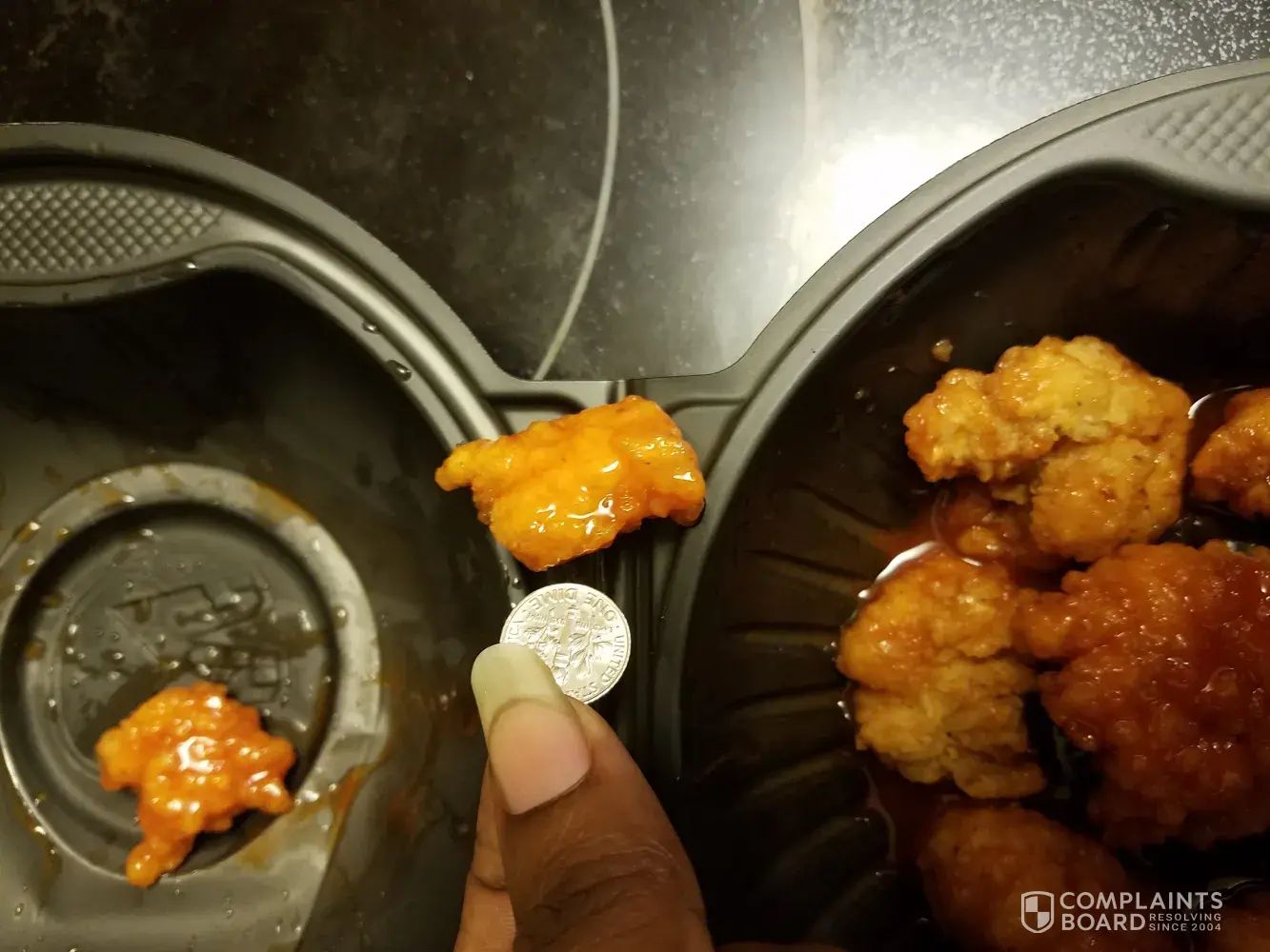 1 bone out wing was the normal size. 3 of them were very small and 4 of them were tiny. I am not exaggerating. It looked like scraps from the bottom of the bag. The wings were so small that there was no meat it was just a tiny piece of crunch. Literally the size of a dime. If I pay for 8 wings, I expect 8 wings not scraps. Very disappointed.