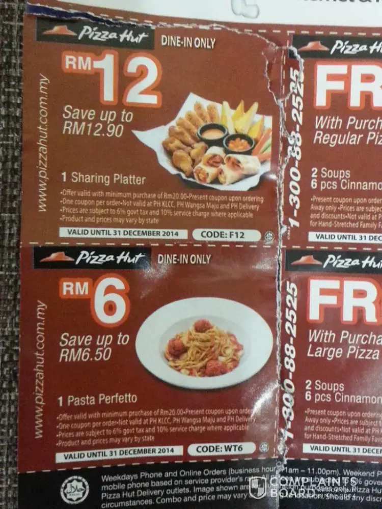 Recently I received the PH leaflet at home and after looking at the promotion I decided to have my dinner with family at PH Bukit Indah JB outlet on last Sunday. We cut out the dine in coupons and place our order. We were told by the waiter that the coupons are valid on Tuesday and Wednesday only, I was so angry! as it was not stated on the coupons. We left the restaurant and not having our dinner there. I feel that PH is deceiving the consumer because all the voucher/coupons that I came across will definitely write in detail the term and condition and also the validity times whereas PH is making the consumer get attracted with the promotion and got cheated.