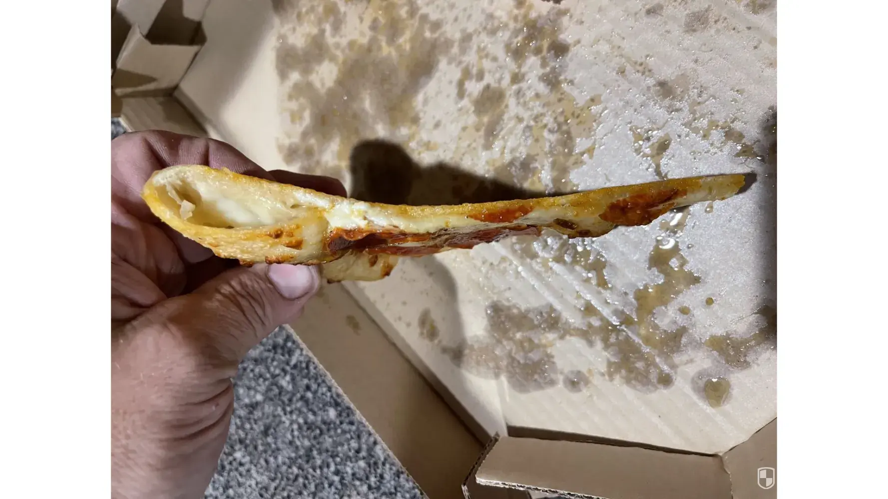 The card board box it came in was thicker than the pizza crust! this is supposed to be a white sauce with pepperoni & stuff crust!