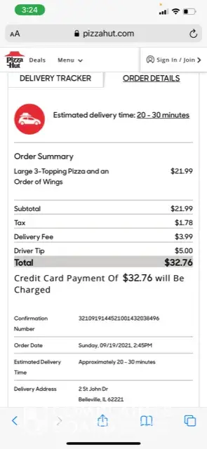 As usual, the delivery from izza hut, in reynoldsburg, oh,