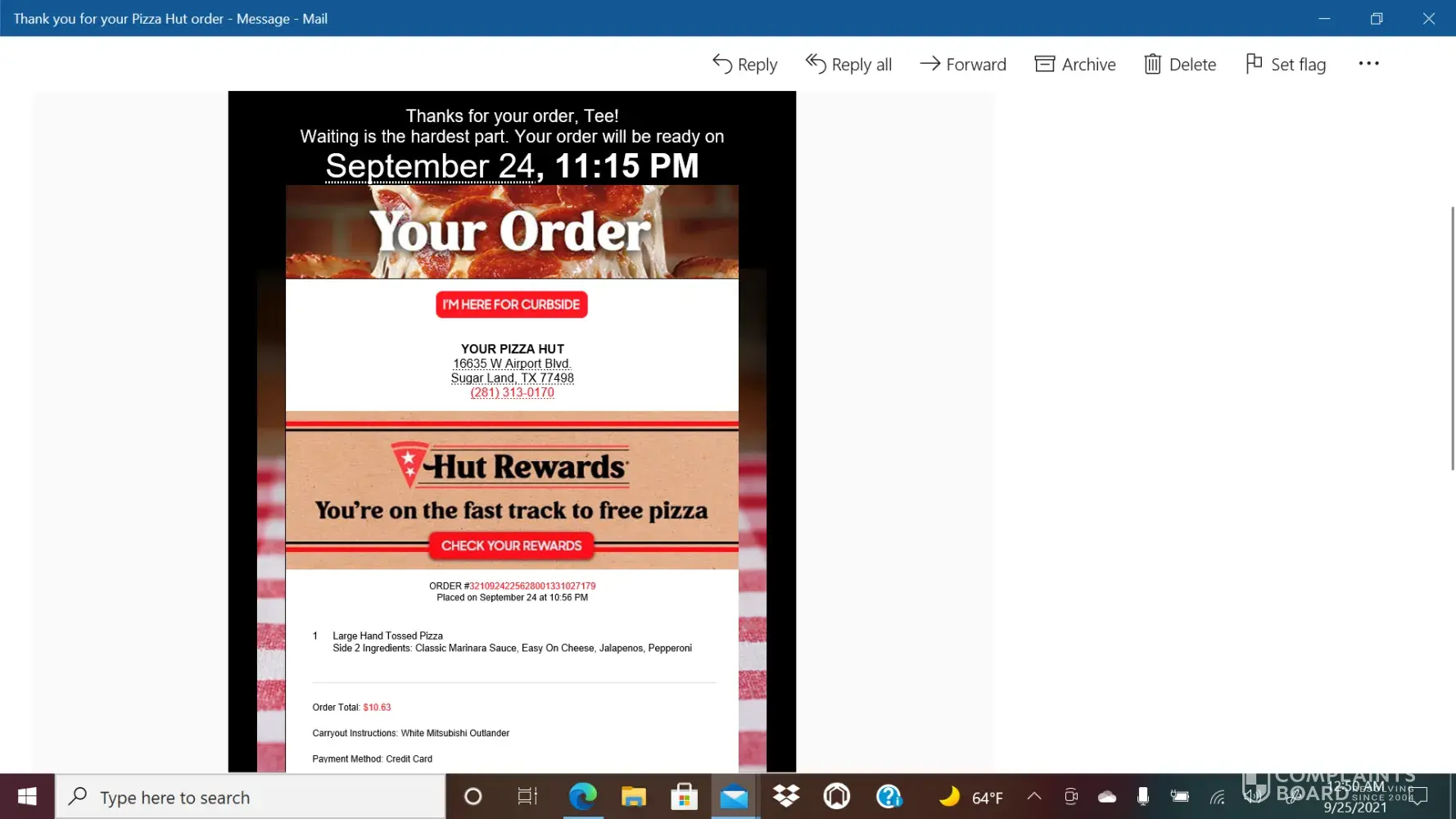 Starting on or about 24SEP2021, we began to receive phone calls from persons stating that they wish to order a pizza, or having a complaint about an existing Pizza Hut Order. In speaking with some of these customers, we were told that the phone number had been provided in an "email" or "text" sent out by Pizza Hut.