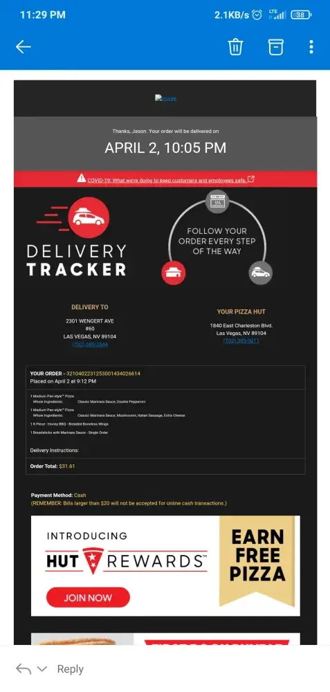 At 9:13 on Friday April 2nd we ordered a big box deal, online, for delivery. In the confirmation email it states the food would be delivered at 10:05 PM. The order total was $31.61 and the order # is 3210402231253001434026614. The meal didn't arrive until after 11:00 and upon arrival after paying we see that the seal is broken and the pizza is cold.