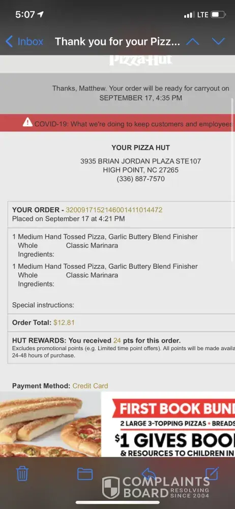 Read full complaintVery bad service at a pizzahut location