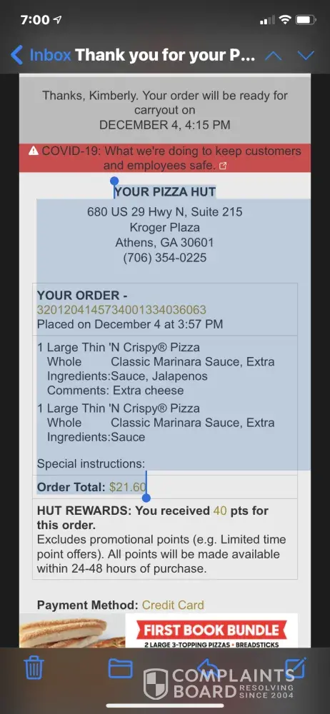Read full complaintPizza I ordered was not correct and the Employee insisted that's what I ordered