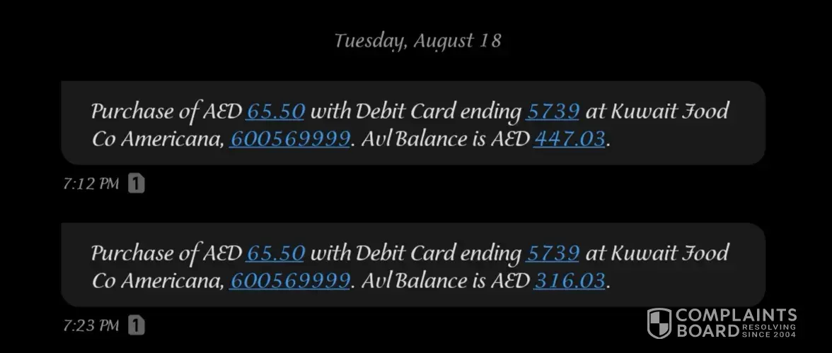 I am attaching the screenshot of the call when we placed the order, the bank message for deduction twice for reference. Please look into the matter.