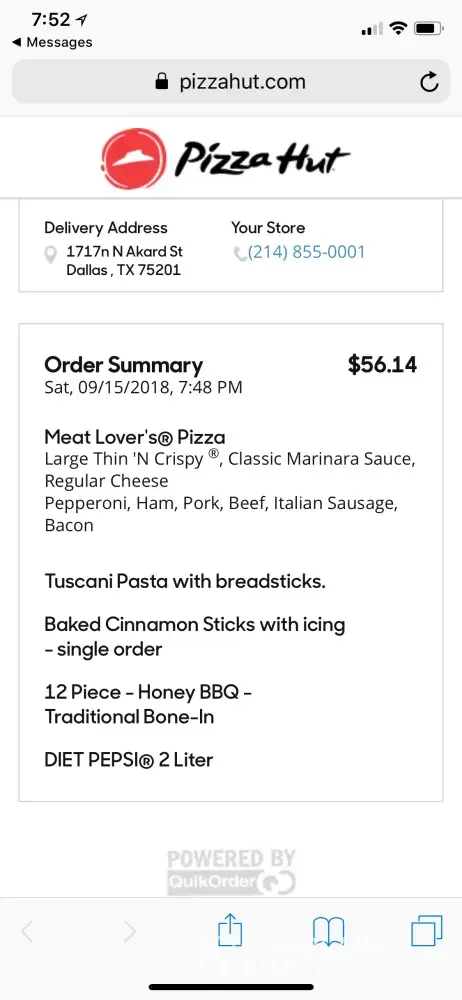We ordered pizza tonight online at the store in Claycomo, MO. And we waited for 1.5 hours before we called the store. They told us the delivery driver couldn't find our address and had tried to call. We made sure we updated the numbers on file and they said they would have to remake the pizzas and deliver. And other 1.5 hours passed and we called again. To witch they told us our pizzas had been delivered and paid for! We didn't receive any food and have three hunger kids at 10:00pm at nigh. We deleted to pay in cash so there was no pizzas delivered or paid for from us! I am VERY disappointed considering we order from Pizza Hut EVERY Friday!