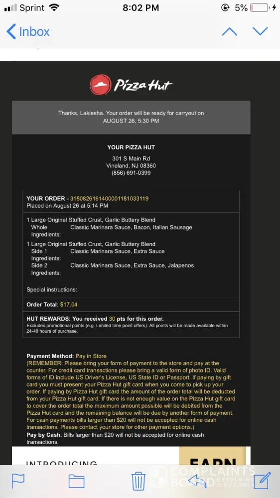 Hello my name is Lakiesha Evans and I would like to let u guys know how I brought 3 pizza's total and I live like 15 min away from Pizza Hut.. I ordered the garlic buttery on 2 large pizzas the 3rd I ordered online but payed cash and got dry crust. My family and I had dry pizza for dinner.. I called Vineland Nj Pizza Hut and all they told me is that I'll get $10 off my next order.. No I wasn't pleased with that but I guess it was better than nothing.. My number is8562657286 I order online often and besides 8/26/2018 on Friday for the buffet at the same restaurant where I reported to the waiter it was ants crawling all over the table around 12:30-1:00pm on Friday at Pizza Hut in Vineland Nj.. All she could say is thanks for letting us know.. Really.. So yes we still payed and I even left a tip.. Just very disappointed this weekend at Pizza Hut in Vineland Nj 08360..