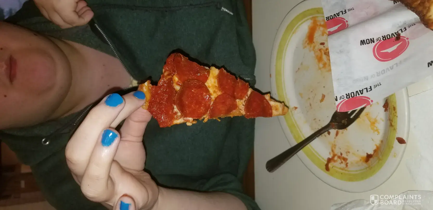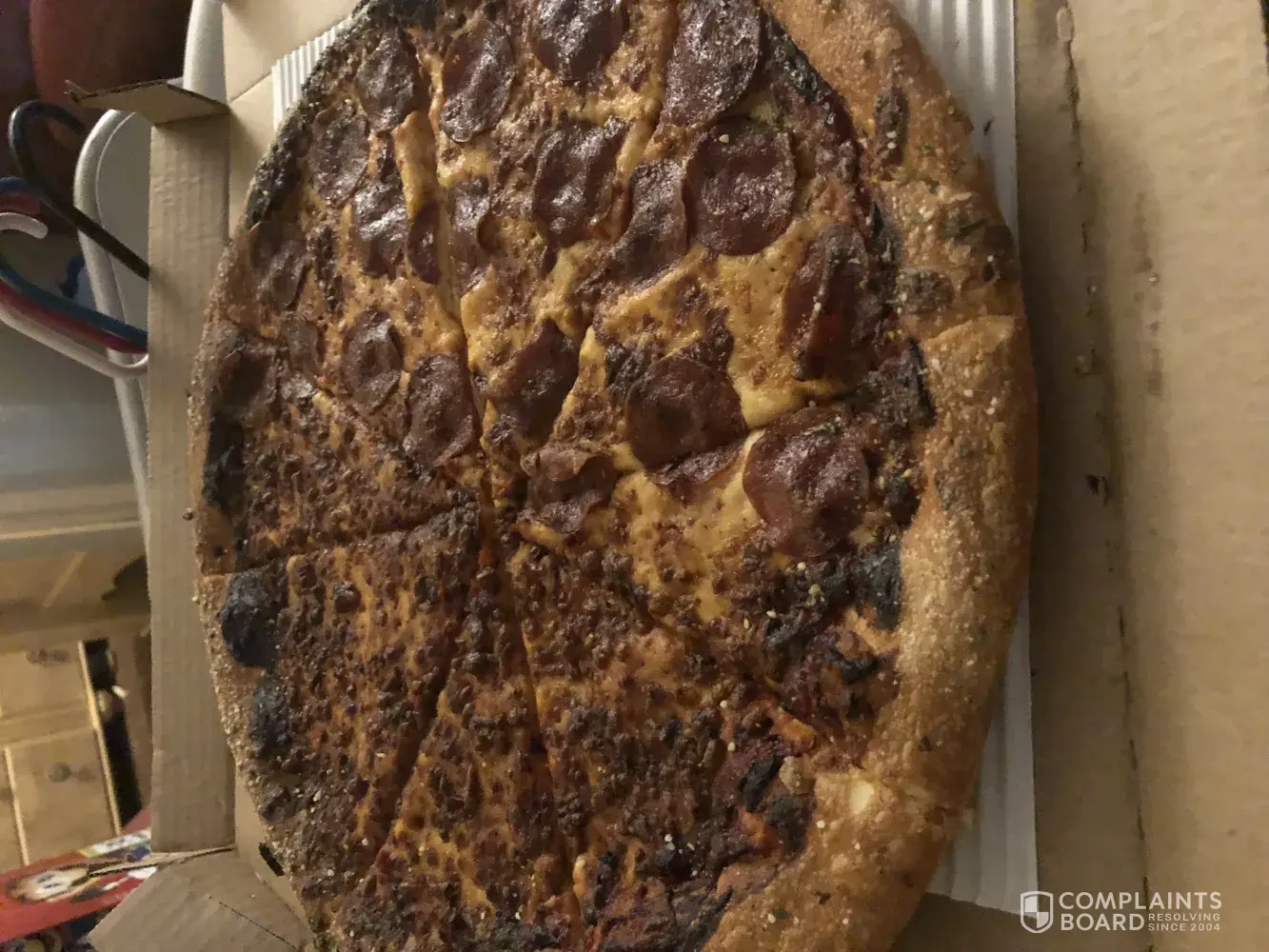 I had an online order of multiple items. I spent $41 plus I am a regular costumer. My pizza came and was completely burnt and 45 minutes later then estimated delivery time. I called the location and I was told they had a couple people call about pizza being burnt and they have 3 more deliveries and couldn't replace my pizza. I am very upset I buy pizza once to twice a week and to receive it burnt and can't not get it replace is very unprofessional. I also uploaded two photos.