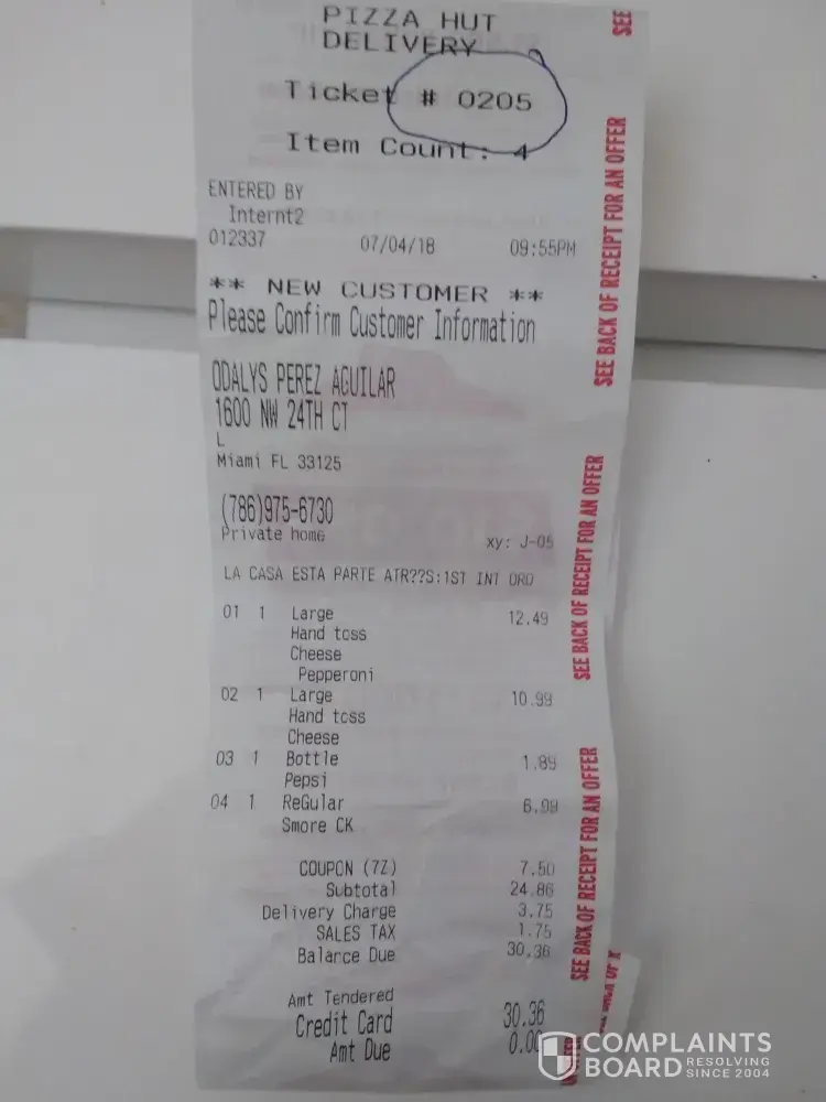 I ordered online with coupon 2 pizza large for 7.99 each and a dessert a Hershey smore cookies and the delivery give me the dessert wrong chocolate chip and the one pizza was charge 12.49 and the other 10.99.I need my refund as soon as possible.I need a credit for 8 dollar that Pizza hut charge to me over price.I'am disgusting.the ticket # 0205 the order was yesterday 07/04 at 9:55 pm Odalys Pérez 1600 nw 24 ct #L Miami.fl.33125