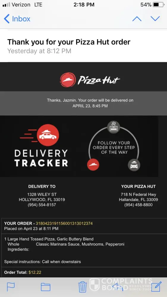 food was never delivered...