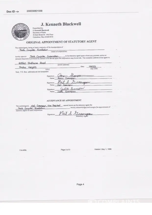 XAVIER BECERRA Attorney General State of California DEPARTMENT OF JUSTICE CT-470 Confirmation of Registration 1300 I Street P. O. Box 903447 Sacramento, CA [protected]-6400 Ext. 4 Fax: [protected] Registration@doj.ca.gov January 16, 2020 THINK COMPUTER FOUNDATION 20560 SHELBURNE RD SHAKER HEIGHTS OH 44122 State Charity Registration Number: CT0267109 RE: CONFIRMATION OF REGISTRATION WITH THE ATTORNEY GENERAL’S REGISTRY OF CHARITABLE TRUSTS The captioned entity has been assigned the State Charity Registration (“CT”) Number set forth above, however, the entity has not yet submitted all of the information required by California Code of Regulations, title 11, section 300, subdivision (b). To complete the initial registration file, please submit the following, together with a copy of this letter: 1. A copy of the Application for Recognition of Exemption (IRS Form 1023, 1023-EZ, or 1024), if submitted to the IRS. If you do not have a copy in your files, a copy can be requested from the IRS at [protected] or https://www.irs.gov/uac/about-form-4506a. 2. An executed copy of the most current bylaws. Please note that the Annual Registration Renewal Fee (Form RRF-1) Report must be filed annually four months and 15 days after the end of the organization’s accounting period. If an extension was requested from IRS, please file Form RRF-1 with the completed IRS informational return together with a copy of all extension requests. The organization’s address of record is used for any necessary contact. You are responsible for notifying the Registry in writing of any change of address. If the captioned organization contracts with a commercial fundraiser for charitable purposes or fundraising counsel, that entity must also register and file annual reports with the Registry. All forms and instructions are available on our website at http://oag.ca.gov/charities. Directors of nonprofit corporations are required to adhere to the provisions of the California Nonprofit Corporation Law (Corporations Code section 5000, et seq.). Trustees for charitable purposes are required to adhere to the provisions of California Probate Code (commencing with section 15000). Please respond within thirty (30) days from the date of this letter. Thank you for your attention to this correspondence