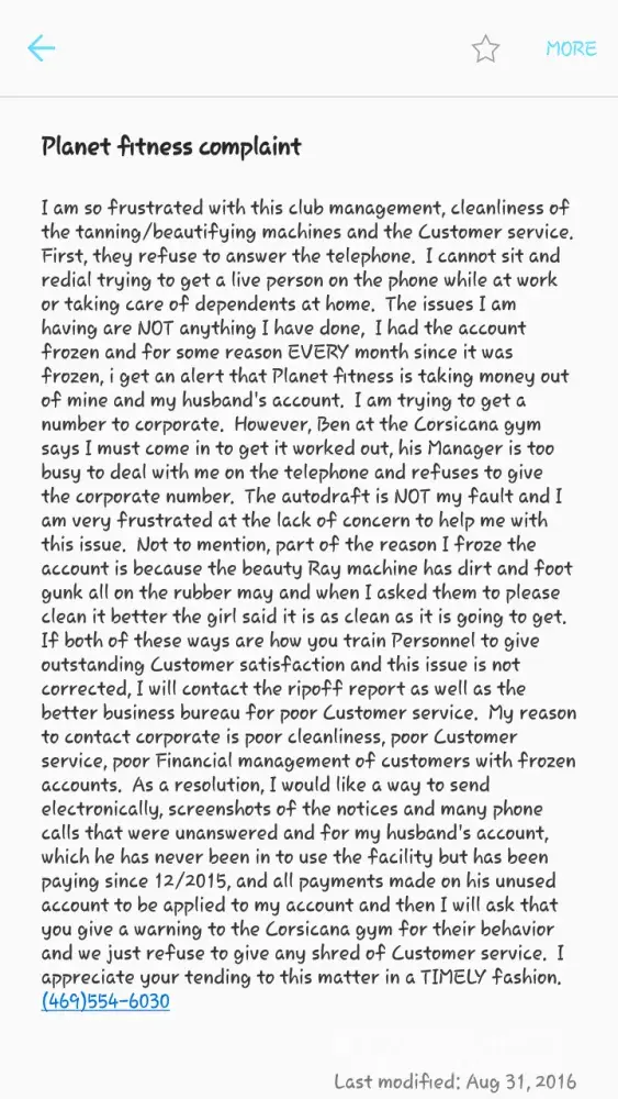 I was just hung up on by the general manager, Sherry, at Corsicana's Planet Fitness. I asked for her to provide me with the date of the first freeze as well as proof that i checked in that day. I was home with strep throat and the flu that day and was not able to go to your Corsicana facility for fear of spreading germs. She told me she would print the paperwork, refused to give me the details right then, said I'm hanging up, "I'm sorry I couldn't help you" and hung up on me. I have been involved in customer service for 28+ years. I have never known any company to be as rude and disrespectful to a customer whom has a complaint. My husband walk a letter into there facility himself with both of our names, both of our account numbers, both of our signatures and spoke with the manager who assured him he only needed the one piece of paper for the accounts to both be frozen. The manager also spoke with my husband because my husband considered cancelling but decided to think about it and just leave it frozen until he decided. So, now because the manager not only lied to my husband but did not do the account freeze and now a member of management had the audacity to be rude and hangup on me saying Lindsay had no desire to speak with me anymore or help me any further. All of this addition to the dirtiness of the facility. Attached are the pictures i told them I had to show the dirt and lack of cleanliness in the club. In some of the pictures i cleaned half of it to show how nasty the areas that bare feet are supposed to be placed on by customers. I did get 3 months to use the gym without a charge. But since i was hit with NSF fees and had a bank account closed because of the planet fitness's lack of care and protection of a customers account, which was $99 + ($21.70 × 3) = $164.10. Planet Fitness has only given me $65.10 back. They still owe me $99. They were setup to draft on my debit card account and they instead were drafting my bank account. Two separate accounts. They told me at the club they only use bank routing and account numbers. However, corporate told me it can be either debit on a card or by account ACH. Too many inconsistencies for a client services facility. And my husbands gym account doesn't even have a picture because he signed up online and never used the facility. If they check their records they will see on their own cameras and computers the day the letter that they claim disappeared, the same day account for myself was frozen, has NO picture or checkin record on me. I am very disappointed and I guess if my money that I pay a great customer service experience and use of the facility your company manages, you feel disrespecting a customer is an ethical and best practice for a company that claims they care for customers, that maybe it is time to alert the media or look to other options for the headaches and nastiness at your facilty. I will wait a couple of days to see if maybe someone over the Regional Manager, Lindsay, feels that customers are your lifeline and deserve to be treated with respectful actions and words. If I had been helping a customer, I would not just pawn that customer off on someone else, i would be sure of satisfaction, and I would notice that this Wednesday is the customers birthday and try to be genuinely attentive. Certainly, not the case here. I guess I was further insulted at the lack of concern or care from the regional, general and facility managers. And with my birthday in a couple of days to be so ugly is just wrong if you really care for a customer who is frustrated.