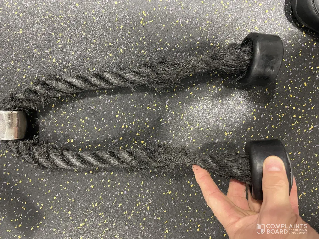 Tattered and torn ropes on equipment. I brought the faulty equipment to the attention of management. They assured me that new equipment parts were ordered and should arrive very soon. This has not happened. Still the same worn out equipment. NEED HELP RESOLVING THIS ISSUE.