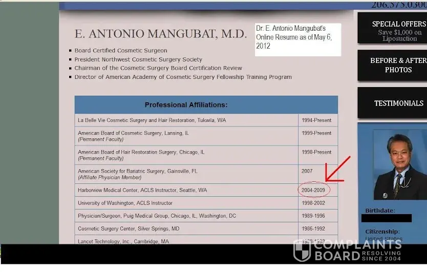 Dr. Tony Mangubat (aka Dr. E. Antonio Mangubat, Dr. Elmer A. Mangubat, Dr. Elmer Antonio Mangubat), LA BELLE VIE Cosmetic Surgery Centers, is INCOMPETENT (Tukwila, Washington) This is a NON-COMMERCIAL posting/website. Any statements I make below are my own opinion. To read PROOF of Dr. Tony Mangubat’s (aka Dr. E. Antonio Mangubat) INCOMPETENCE, please...