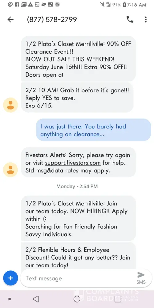 I go to Plato's Closet in Merrillville, IN. I signed up for their text messages & rewards points. They're constantly blowing my phone up with messages. I get a message that says, " Buy one Get one 50% off your next visit expires 6/26" SO, I rush to the store for this. I gather all my merchindise. Then at checkout they tell me it only applies to one item. Wtf is that! That is NOT what the text said. I also got a text that said, " 90% off Clearance" Does that only apply to one item? Then I got another text that said, "Double Points off on your next visit expires 6/27" Does that only apply to one item?