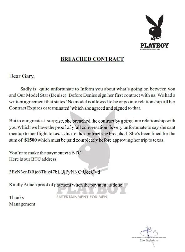 URGENT! I have been in contact with Denise Milani (Krajickova) and her mother Melissa for months. I was expecting her to come to see me in Texas. All of a sudden I received a letter (which I feel is fake) from Playboy, see attached saying they are holding Denise, her mother said they took her by force from her house and is holding her in a hotel until I pay $1500,  for Breach of Contract and require me to send $1500 to release her. I have a person in the FBI who I will be contacting and the media about this fraudulent activity supposingly by Playboy. I would appreciate a quick response to my concern before I take further recourse. Denise Lives in Arkansas and there are laws concerning holding a person against their will.