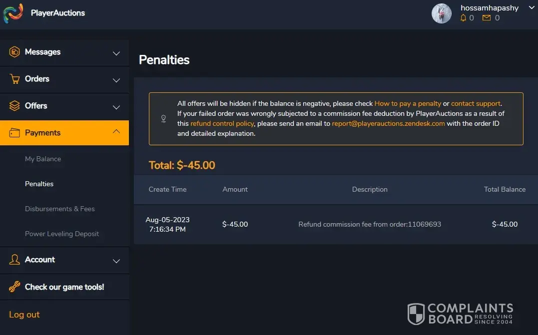Ineed really help not putting the policy of playerauction I need to know why iam suspended because after talking with support answer is the same I need to say somthing something wrong here the only buyer that have problem with me I refunded him with 450 $ and I have penalties 45$?! Other money is mine understand the issues 885$ is mine 4 sales are right the 5th not completed and I didint take it what happen here please help for only one mistake I didint mean it all this happen for new seller didnt understand the money please 855$ is successful selling people have the accounts and leave good feedback and 5 stars how refund them with my money I cant understand the only thing I have is (one penalty 45$) and I need to pay it cut it from my855$ and send me all of my money please I didint need answer by copy and paste policy my issues something wrong in it for only on unsuccessful sell I get ban iam really sorry for everything but I need my money my rights my name hossamhapashy [protected]@gmail.com