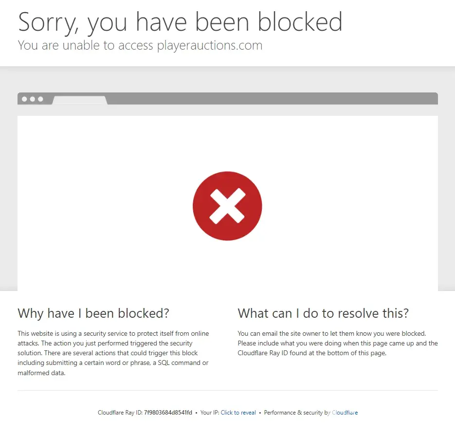 I have used PlayerAuctions since 2020 and have always had good experience and enjoyed it, but now for some reason I cannot log in or enter the webatie because Cloudflare blocks me both on my phone and pc no mattwr what I do, I want to be unblocked, if possible at all.