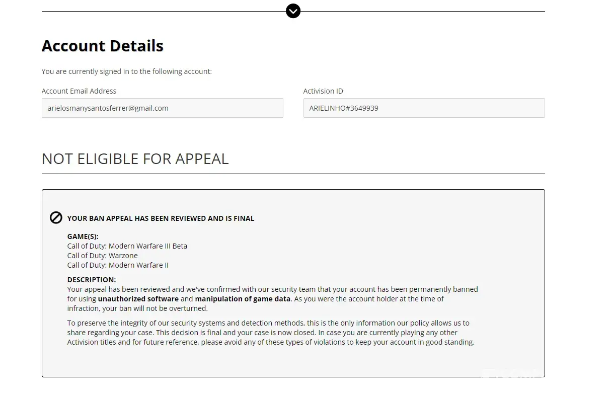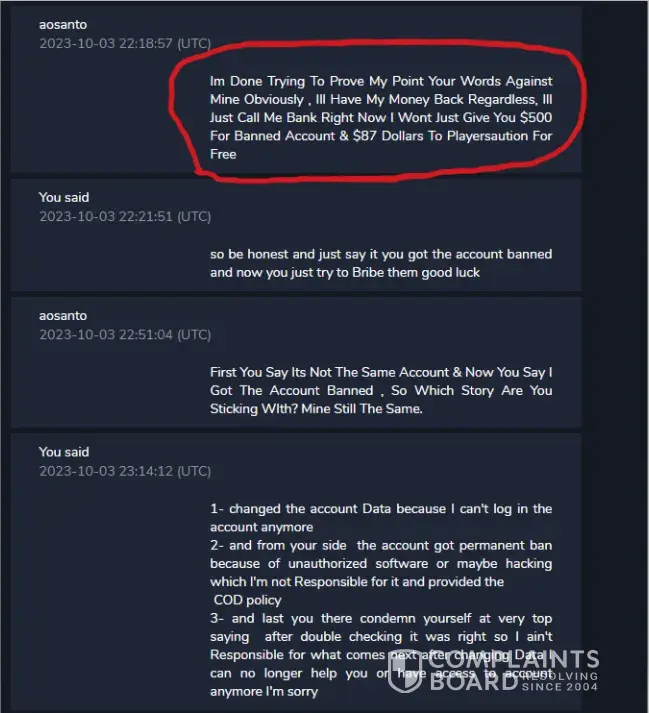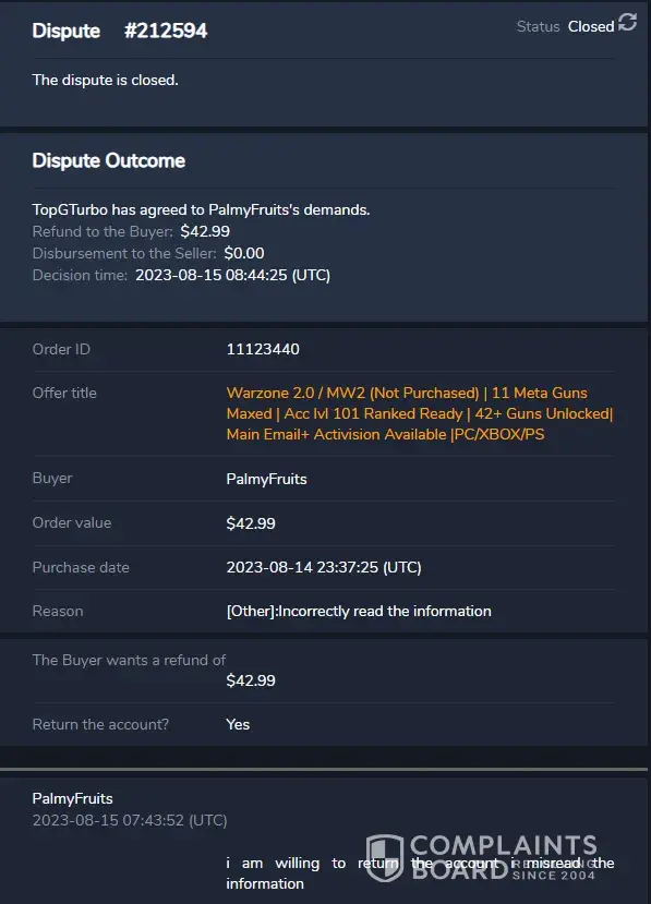 Relogin, account was perma banned) now he got my account working with no problem and checked it twice found nothing faulty in it everything working and came as exactly how I described in the offer once he changed the data the account got perm ban now I provided him with every instructions to how the access the account for not get any type of ban and from cod (call of duty) policy it gave us clear rules why the account get ban so as example you have 2 type of ban shadow ban and perm ban for shadow ban you may get it from open the account with different ip this may last from 4 to 7 days and get unblocked and account working fine with no problems at all. Every cod player know this in his situation he got perm ban so the perm ban comes from this it ain't my talking it cod policy please have look at it - (https://support.activision.com/articles/call-of-duty-security-and-enforcement policy)-now you can see below in picture 1 that's my account just before I post it in pa it says no ban detected at all the games in the account now look for the 2nd picture from cod policy it says below types of perm ban in cod policy there is no way from changing emails to get the account perm ban okay and even posted picture before clarify my account didn't have ban before selling it to anyone and the buyer from beginning stated he checked the account twice you can see that in the 3rd picture for yourself below clearly say this. Now we know changing mails don't get the account to get banned see the 4th picture please he put this in the dispute so the only type of perm ban is due cheating or maybe having unauthorized software on his pc we don't know what have he done so we kept talking on an on with no solid ground and he posted this see it for yourself 5th picture please. He changed all the data of activision and battle net he changed everything now I don't have access to anything at all so now maybe the account get ban or maybe not we don't know so I said to him is this. Where is the ban email which is sent to you in own gmail he said this at picture numb 6 and showed this to the pa support team that activision sends email notify you the account is banned due to cheating or whatever at picture number 7 and we kept talking and he even insulted me with this at picture number 8 and even he tried to bribe pa team with this which I am quite shocked at it at picture number 9 and I even posted this on reddit and post got taken down because the moderators remove it I don't know for what reason to be totally true you can see for yourself here - (https://www.reddit.com/r/CallOfDuty/comments/16zm52c/cod_what_is_titles_ban_in_call_of_duty_warzone_20/?rdt=38093)- so now pa team decided this issue in the buyer favor so now buyer have the account working and have the money and I didn't get my account back after all so now pa team even congrats me with 50$ penalty and removed all my offers from my store which you can see for yourself at picture number 10 and my store with no 0 negative feedback none. I'm quite shocked to be honest and devastated I don't know what to say please look to this again it must be something wrong. It can't be for any scammer comes have the account change the data and ask for refund and they just give them the money i'm shocked.