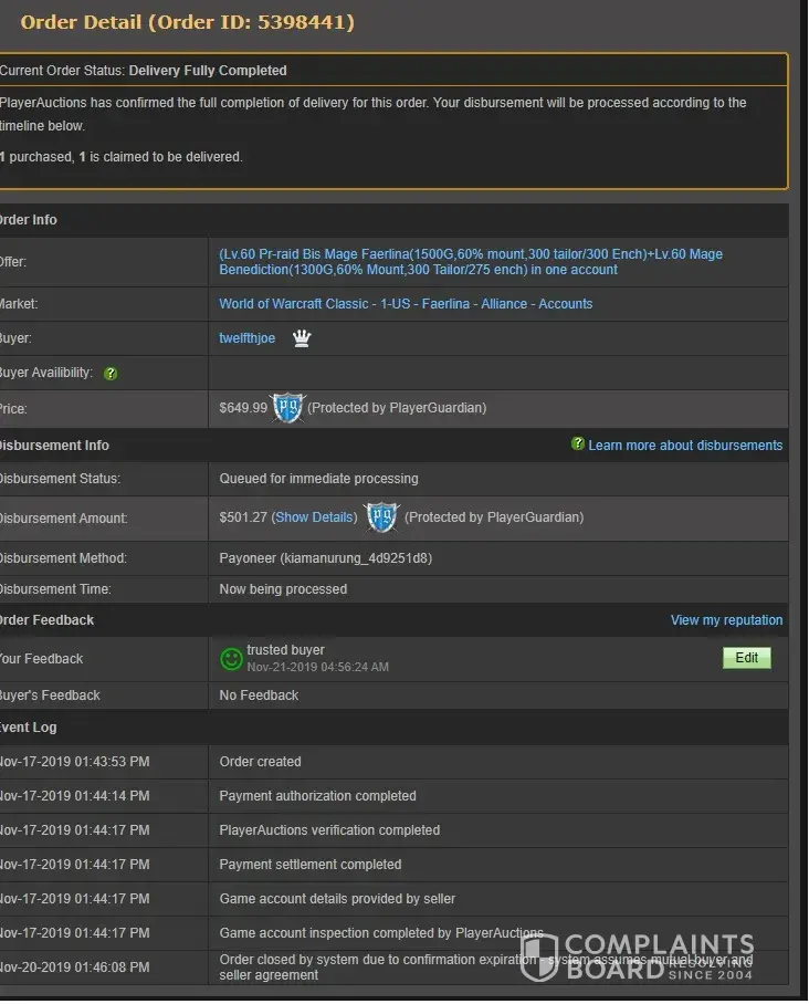 My first time using Playerauctions webservice and I already just got mixed towards bad feeling about this. Most of the time I use discord and forum whenever I try to sell any account or gold on certain games that I played. I played WoW and also plan to sell my account to move on to other games. My "potential buyers" somehow urged and even recommend me to use Playerauctions.com service as medium of transaction as the website offers "warrant" and "trust". So I decided to give in since it's not cheap anyway, around 600$. My first potential buyer came in and wanted to make payments. Then started from there all the problems began unfolding. Rejected payments, delayed transactions, rating system priority, excessive fees, complicated refund and dispute systems, penalty systems, slow customer service responses, etc., etc.