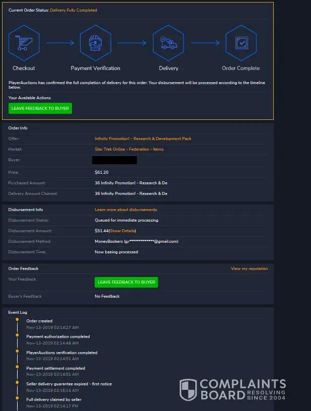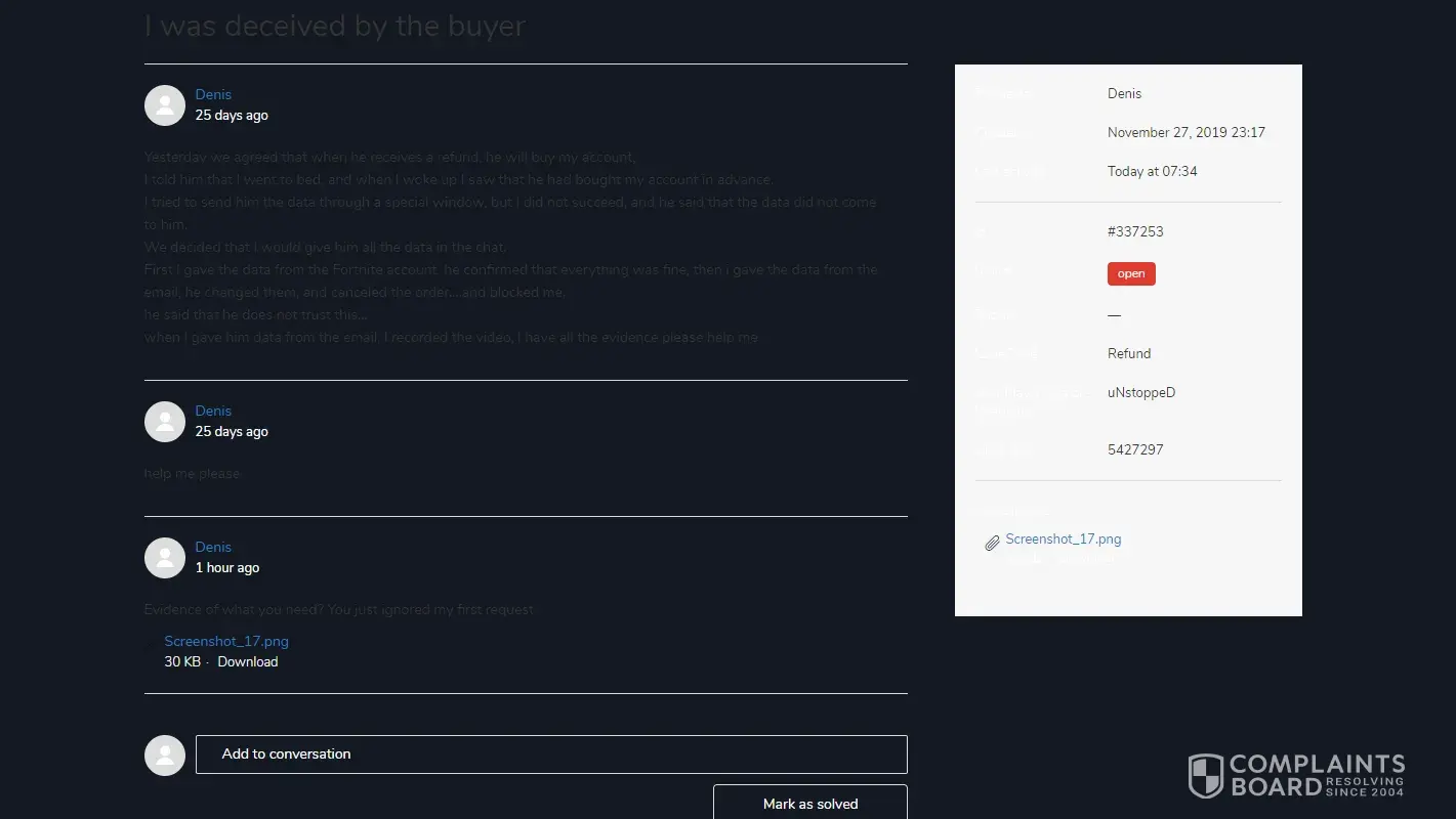 14 November 2019 - Purchased a Black Desert Online account from a seller. The seller noted that the Black Desert Account was on a Steam Account that would be sold as a whole. My order number is as follows: 5390903