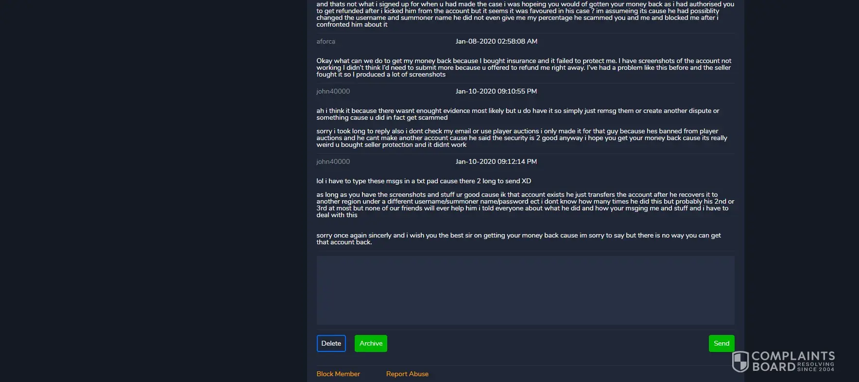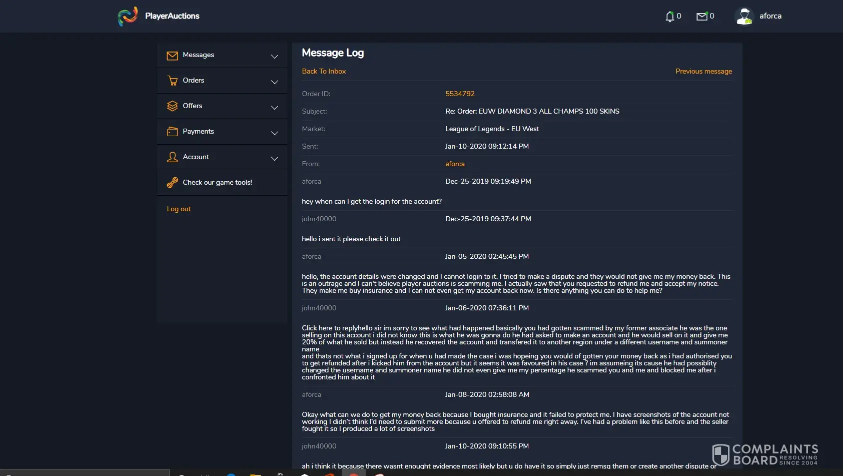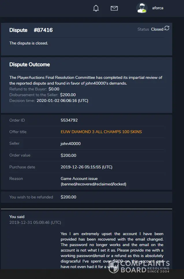 My username is 'aforca'. I'm a long-time customer of PlayerAuctions and purchased a League of Legends account from them on December 26th, 2019. The account was titled "EUW DIAMOND 3 ALL CHAMPS 100 SKINS", and I paid $200 for it, at the same time paying an additional $15.98 for Account Insurance. I expected that if the account I purchased had something go wrong, such as being taken back, I would get my money back because I had purchased insurance. A similar incident occurred on the same site in the past when I purchased a Runescape account, and at that time they fully reimbursed me as promised. Basically, this company previously had a very good track record in my eyes and had my trust and continued patronage.
