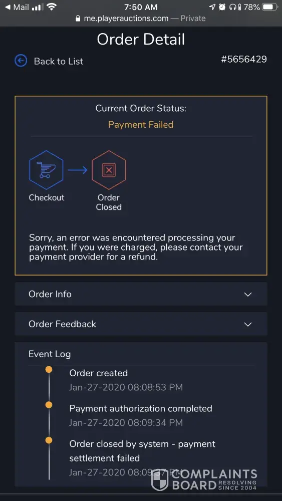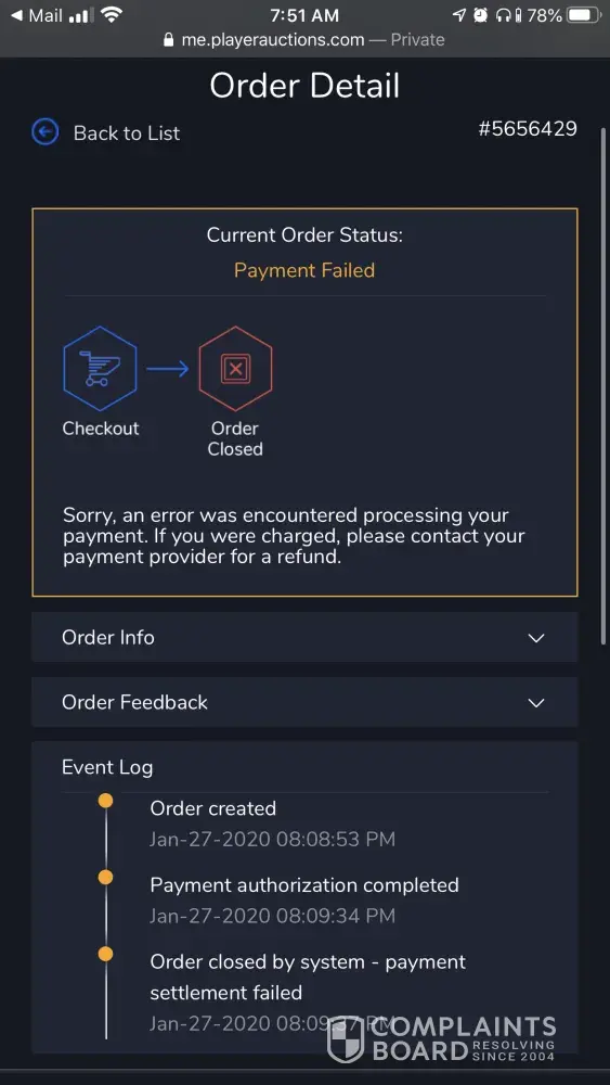 I tried purchasing an account from @playerauctions and the site charged then claimed that the payment failed. On there support link page of the playeroptions website they have a section that goes over this and says its a "fluke" from their verification system and that the money will be returned in up 5 business days or that you can re do the purchasing process and it will cancel your first payment and go through.