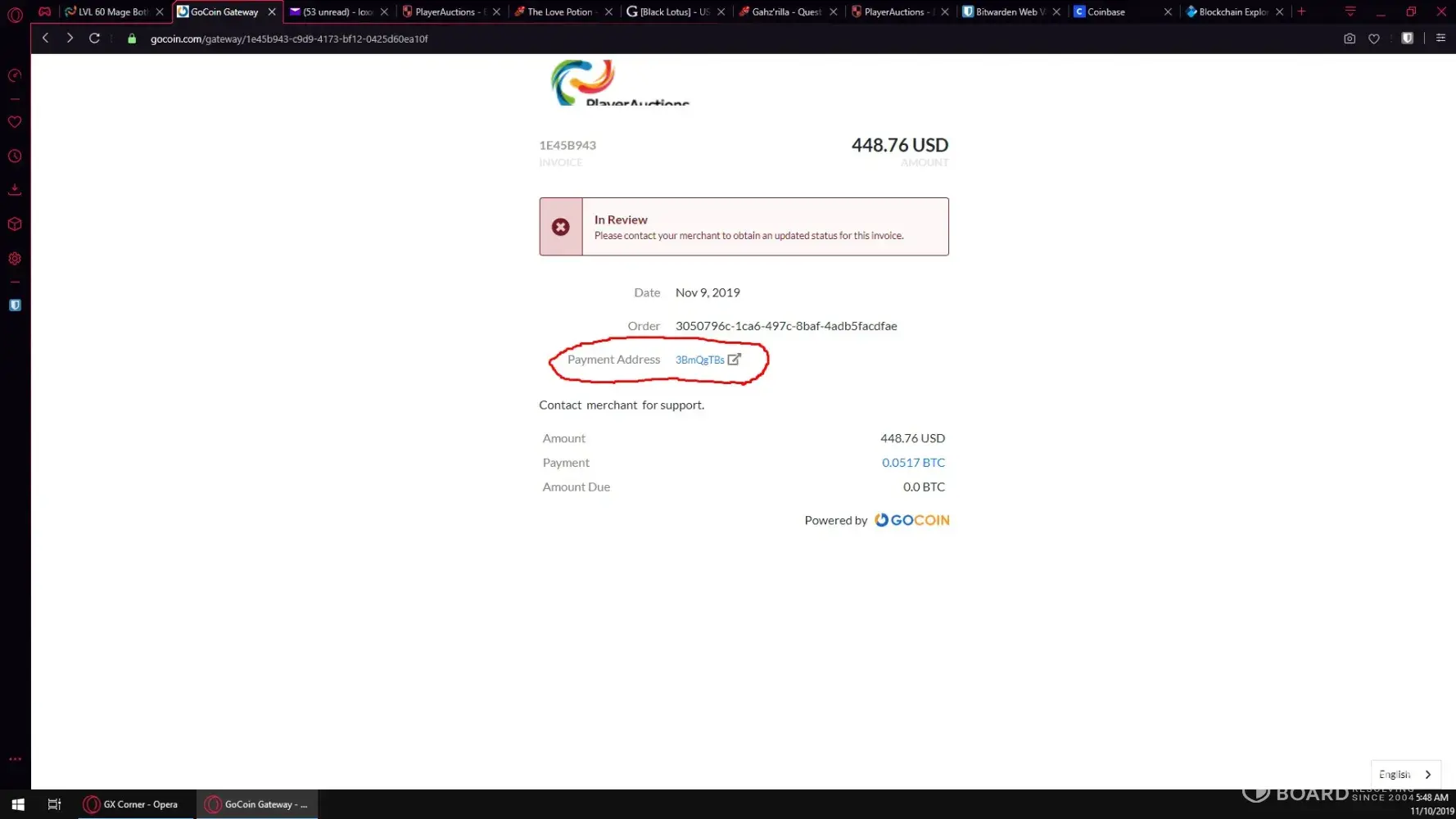 Still haven't received an update on how I can get a refund. They are claiming a payment hasn't been "captured, " but the link I was given by GoPay for the PlayerAuctions invoice clearly shows that the money has been received on that wallet. As is shown in the screenshots.