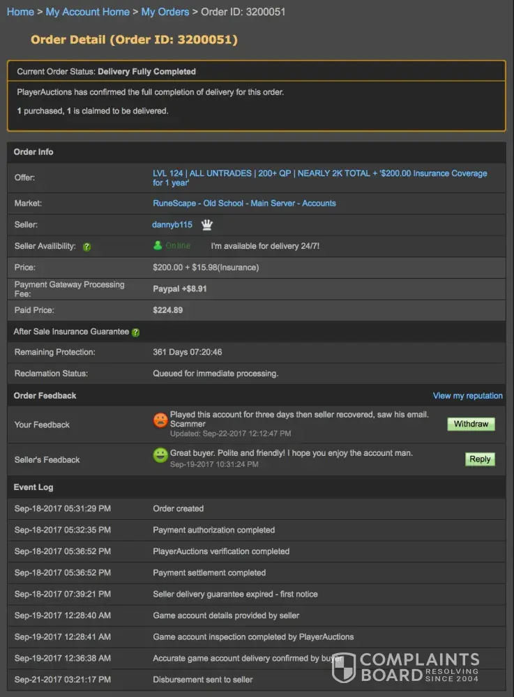 Recently, i've purchased an account (Osrs - runescape 2007) for $200 usd (With 1-year insurance) on playerauctions.com. The seller delivered on 18th september 2017 and the account had no problems. I changed the password, and email to my own, he also provided me with the recovery details.
