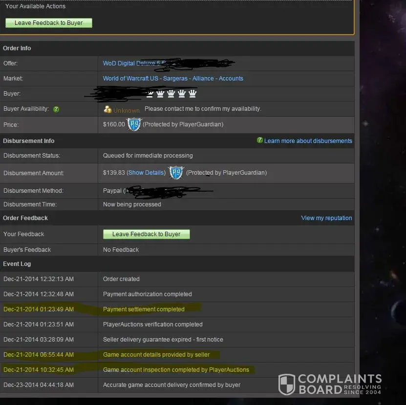 I will start off by saying I have done a few thousand USD in transactions on Player Auctions and they went smooth. It was on my most recent transaction where I ran into serious issues. I sold a World of Warcraft account for the $150-200 range and was to receive payment in the $100-150 range. The payment was never disbursed to my account.
