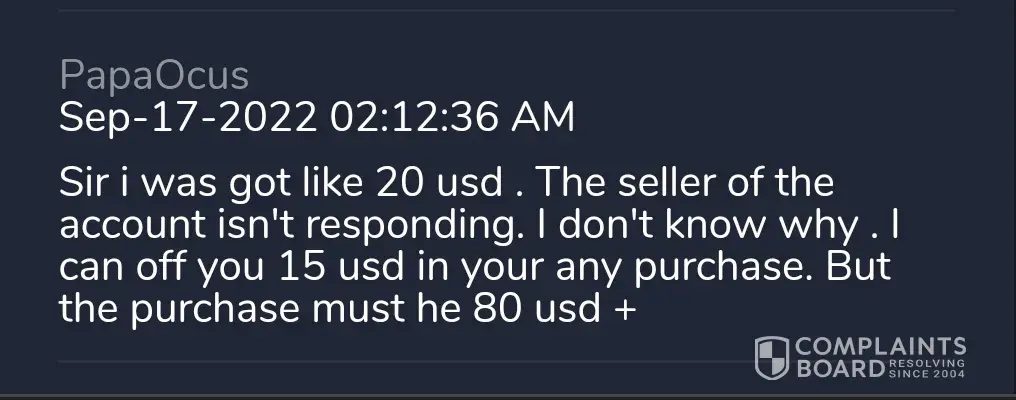 Desired outcome: An account of equal value to be provided by seller PapaOcus, or a complete re-fund based on the market price of the account in it's current state