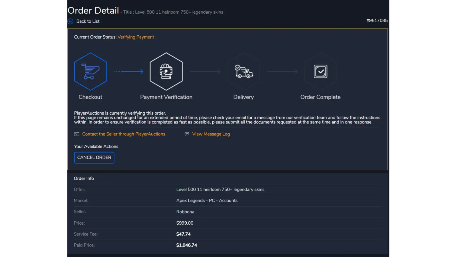 I Paid literally a thousand dollars for this really rare Apex Legends account yesterday using my visa card via skrill. But the status was stuck in the payment verification process ever since then. I have received nothing in my email, no instructions, no notifications, nothing. It is a huge transaction, but at least keep me updated on the situations going on on your side. I would cooperate if any instructions are given. And your LiveChat at the helping center was also irresponsive. What happened? Don't exhaust my patience and leave me with no options but to cancel the order.