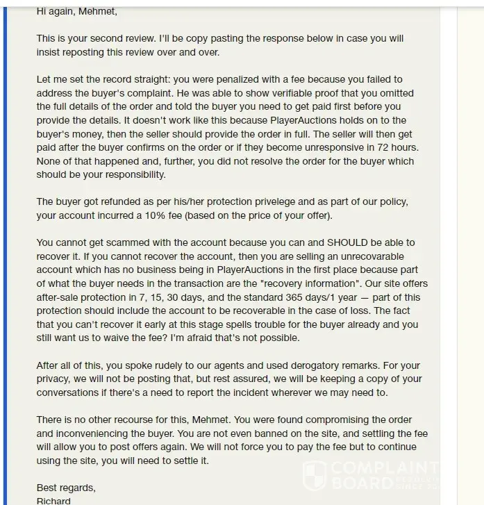 3. by one of YOUR OWN replies on trust pilot, the seller being a reseller is supposed to automatically make him at fault. So basically you say everyone can claim to be a reseller and they will never be found at fault? "Well, I'm not the one who reclaimed the account, I just sold it". So there is zero recourse for the buyer in this scenario.
