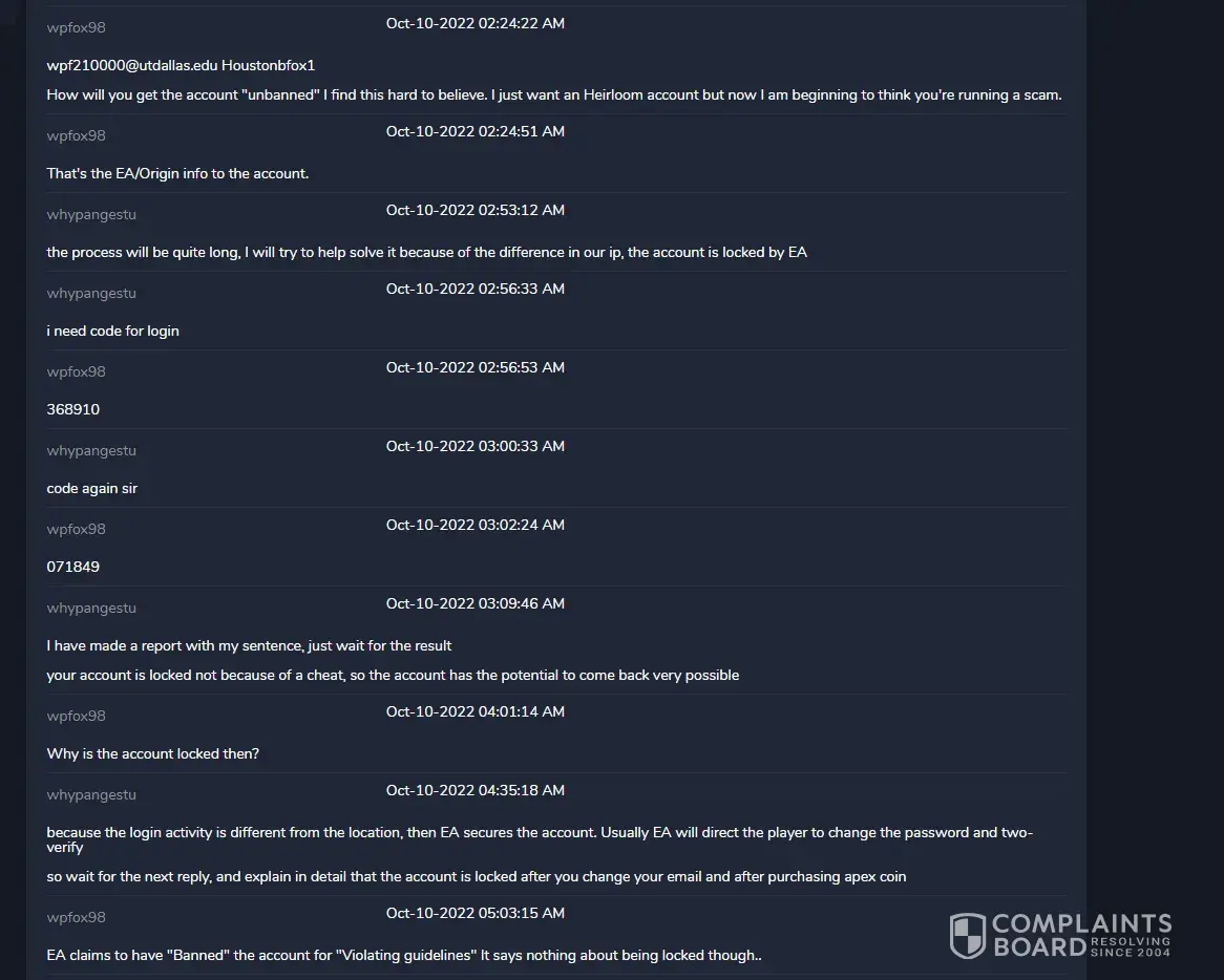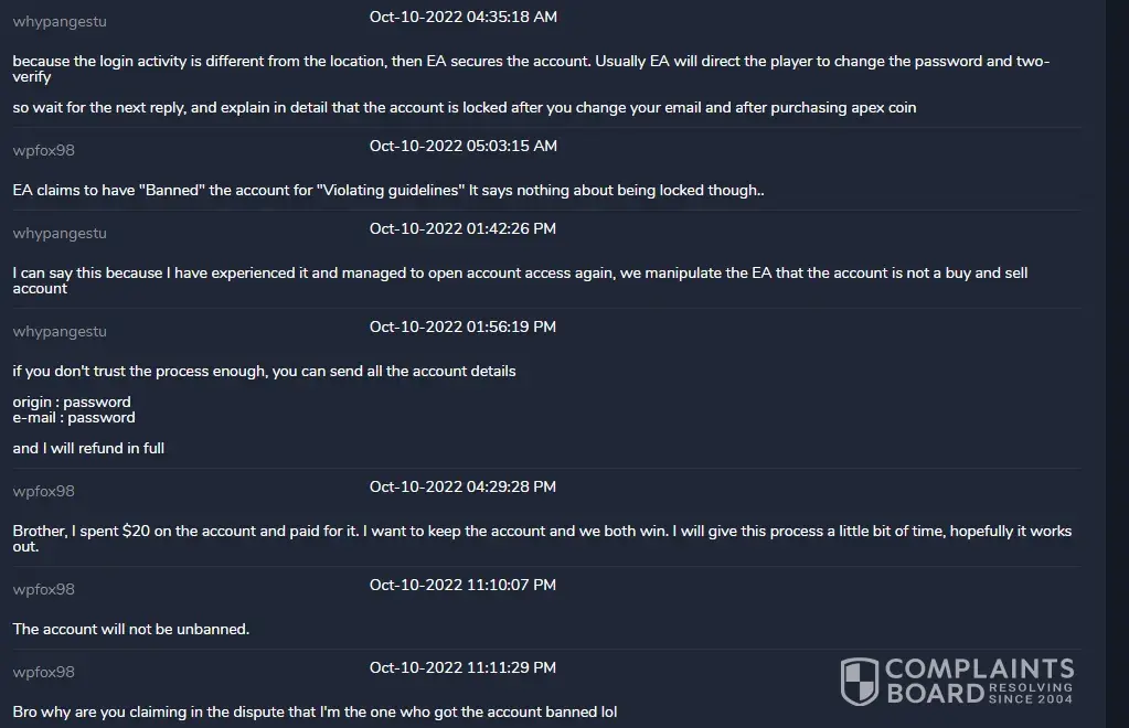 My account name is wpfox98. I recently bought an Apex Legends Account from some seller based in Indonesia. 2 days after Purchasing the account, the account is now permanently banned. The seller claimed in dispute it's my fault the account was banned. In direct message he literally admitted that sometimes EA bans account he sells and he would work with me and appeal the account. I did not want to work with him and escalated the dispute only for him to win. I provided screenshots of the conversation and Player Auctions arbitration team STILL sided with him. Are you serious? Player Auctions Is a COMPLETE scam! Buyers have the same rights as the 13 colonies under English rule. The buyer is given a coin toss hoping the person who reviews your dispute is actually a human and not a bot. I think i'm going to start hacking and selling Apex accounts on this site, why shouldn't I? If the account gets banned right after I sell it, i'll just shrug and likely still win the dispute. Lost for words.