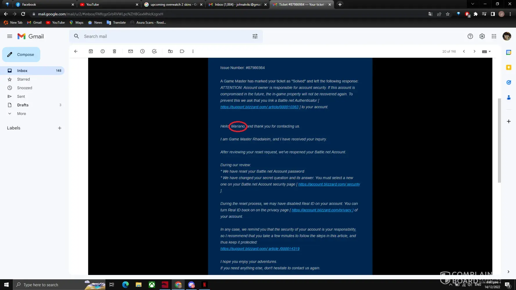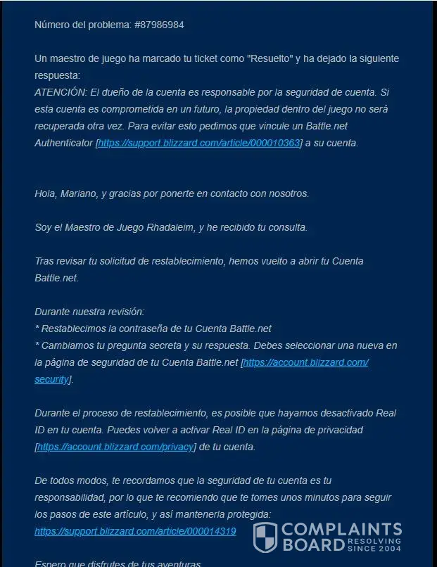 The seller said he got nothing to do with the account he sold, since it already sold, but how about and why the email i got received from before the account got compromise was his name (Mariano is the name of the seller i bought the account) It's either he filed a ticket and blizzard responds goes to my email since i changed the email of the account. so this is not enough proof that the account was recover by none other than the seller(Mariano) himself?, i properly asked the seller to help me and just recover the account if it was not his doing, but he doesn't care at all and always said that he can't do anything while i said that he has a big chance if he's the one who recovered the account and just give it to me again via email or playerauction message, the seller was very unprofessional.