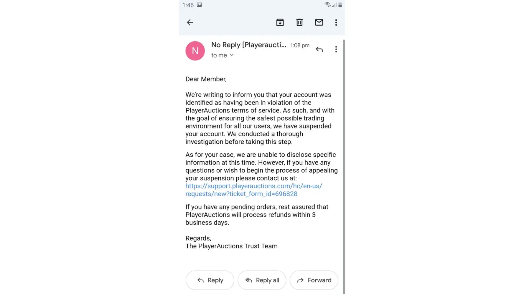 5 days ago on 12-04-2022 I got the email that my player auctions account got suspended and they did not mentioned any reason. After emailing them they sent me this following email: