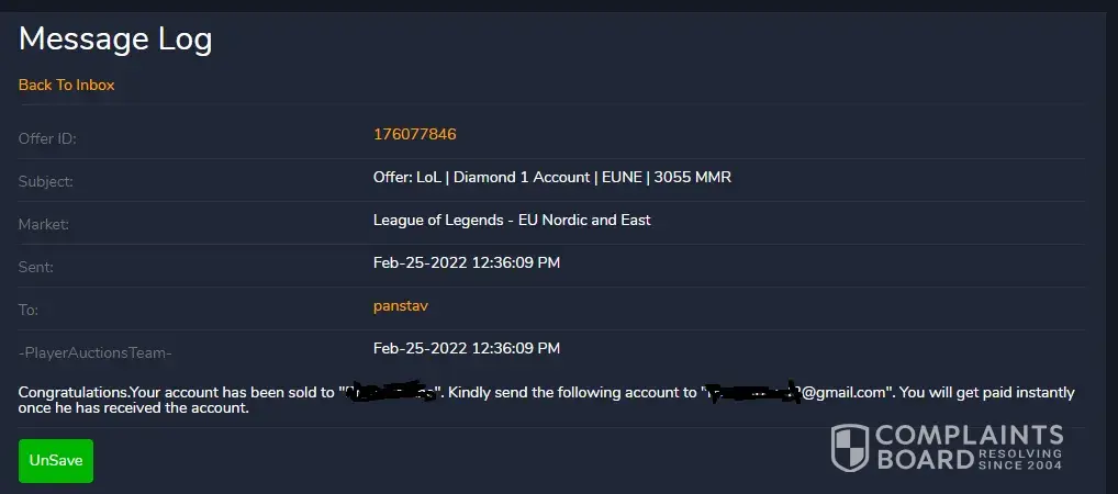 On Feb-24-2022 I put a League of Legends account on sale. Later that day I received a message from your team saying: "Congratulations. Your account has been sold to "(name)". Kindly send the following account to "(his Gmail)". You will get paid instantly once he has received the account." .