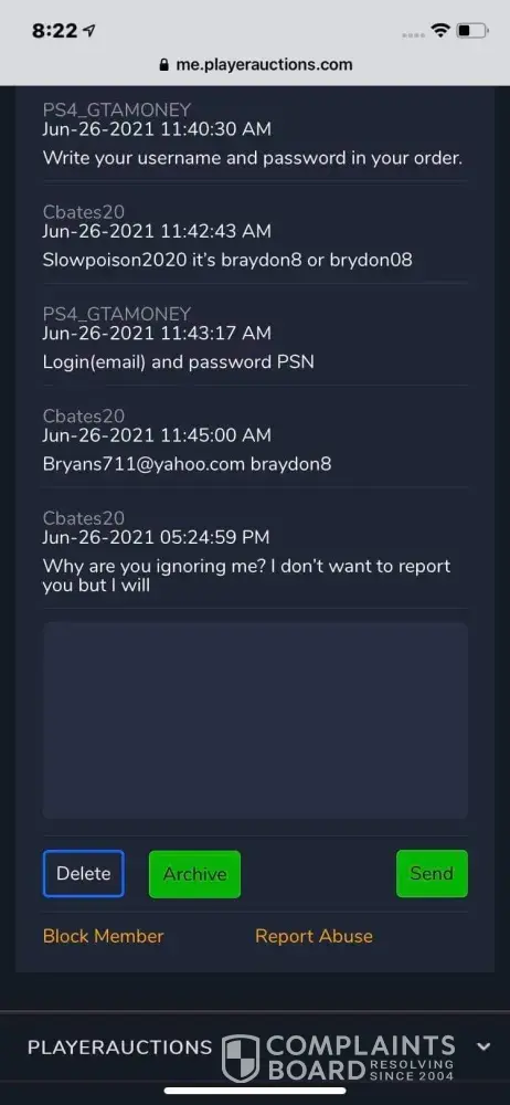 I received a response from trust compliance through email and what they told me is different from what you're telling me. If PlayerAuctions is going to lie at least make sure everyone is on the same page. If you look at the images the PA employee states I've been reported by multiple buyers claiming their account was recovered or hacked. I've had only one buyer and this is literally out of 4-5 years. Only one buyer has done a dispute claiming I stole the account back. I submitted proof and PA resolved the dispute in my favor. This dispute started at the beginning of May and ending the middle of June. How can PA claim I'm selling illegal PlayStation accounts when it's my own account and the account in question had a dispute that was resolved in MY favor?