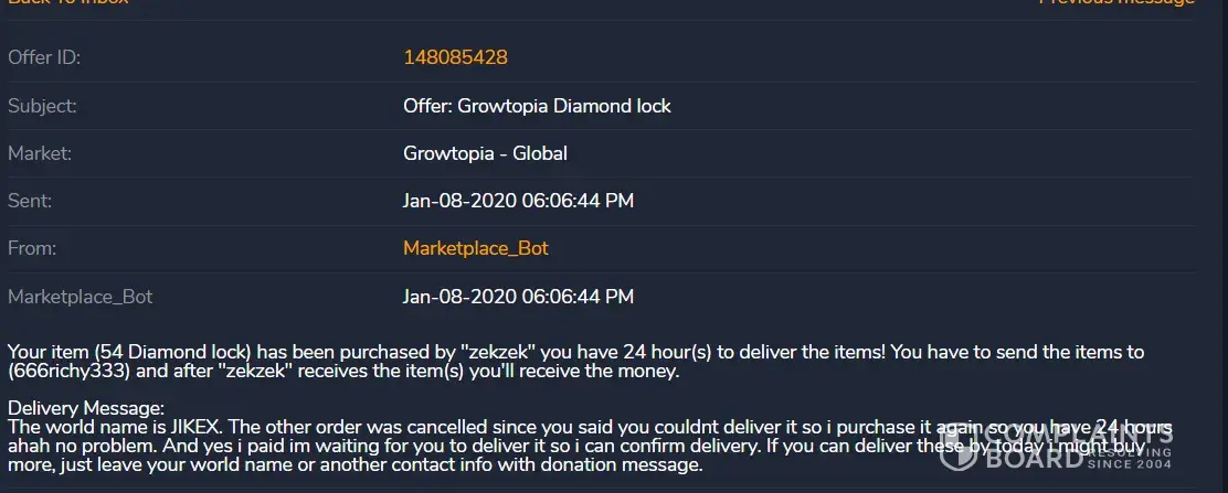 at first he bought my item then cancel it and change it with a bot. It's my first time doing this, please help me i have been scam twice in this site. I know it's my fault and i'm wrong please i beg you. i have send 34 diamond locks to the person.