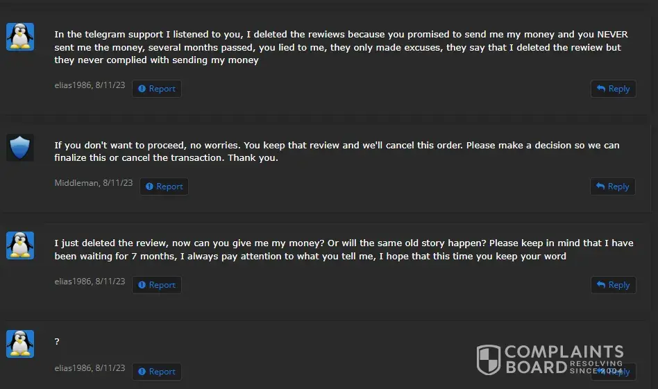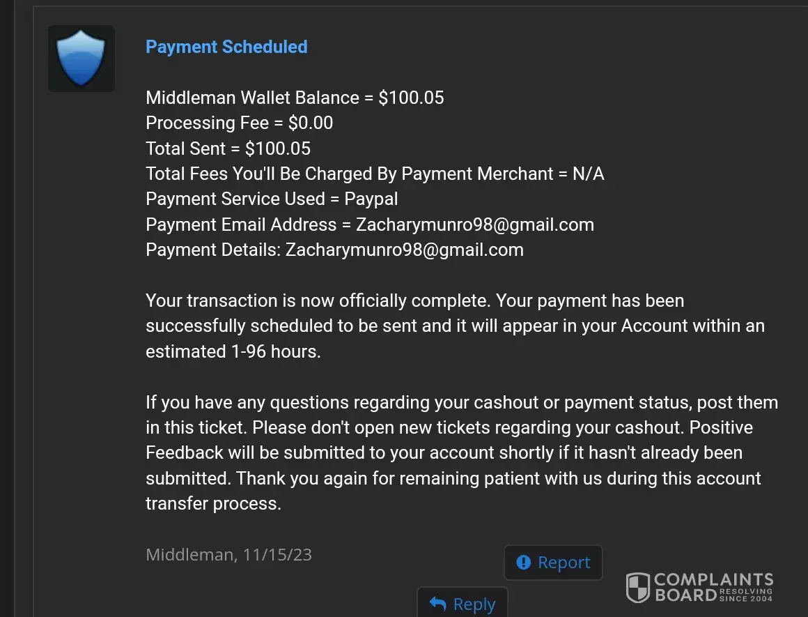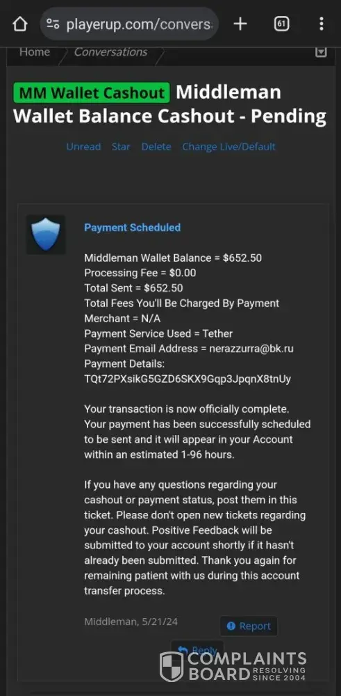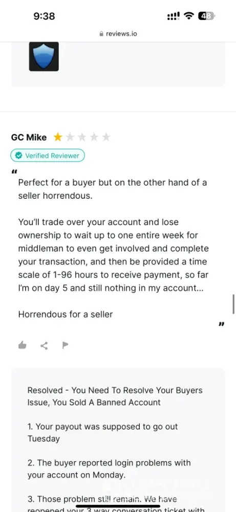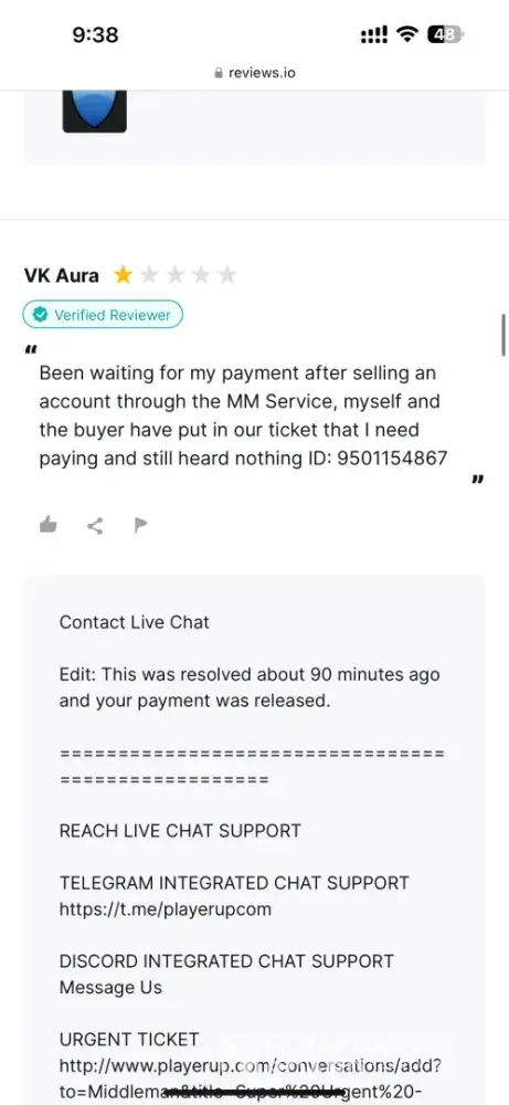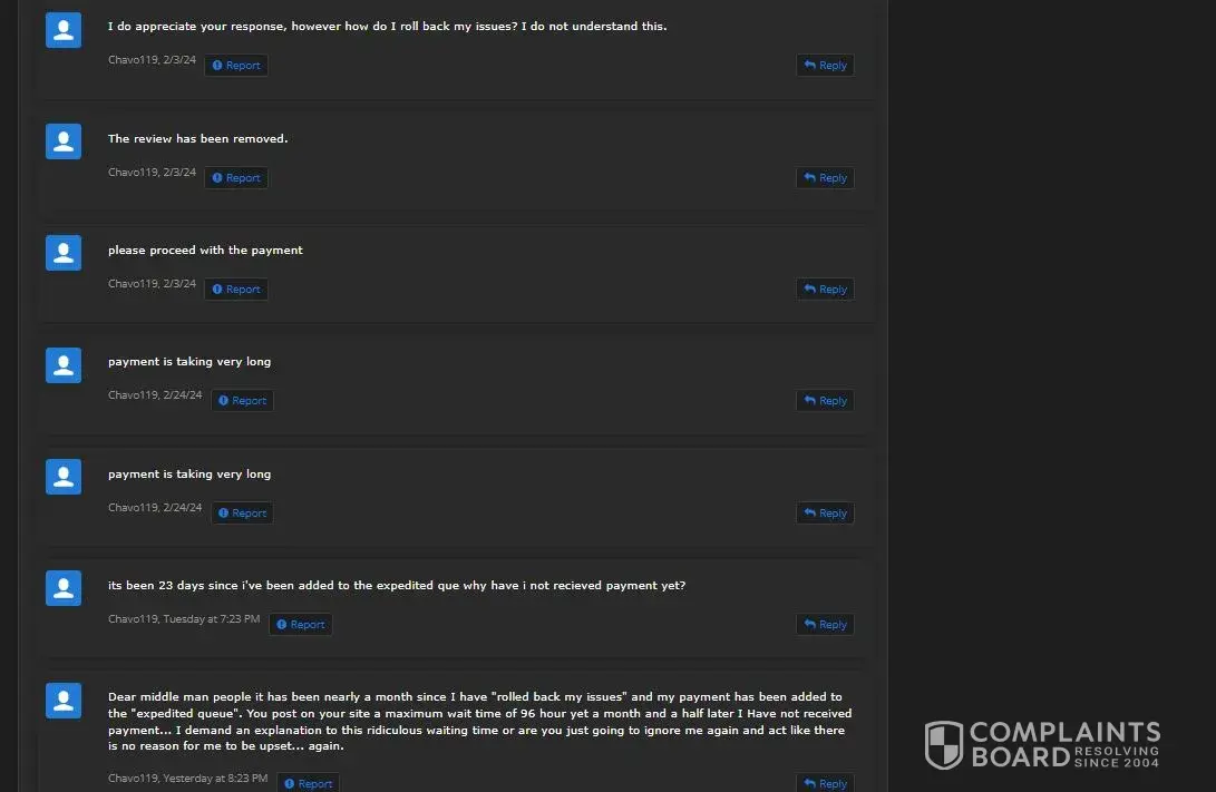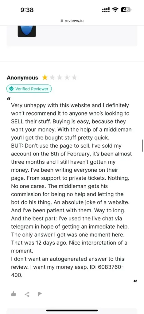 If you use Middleman services, they will waste your time, make your experience so miserable and you'll never get your money, ever! After selling my very old high quality Reddit account (+500k karma!) I have been waiting for over 2 months for them to process my payment. Initially I provided them with my PayPal information and ID, but after ignoring me for over a month, I provided 2 more payment options just in case they may have delays with PayPal. I kept asking for payment status about once a week (via PlayerUp pm, forums and Telegram) and didn't get a single response from Middleman or staff for weeks! The worse thing is "last seen 1min ago" every day I log in which means they are deliberately refusing to pay me, that and the fact they banned my posts on the forms without any feedback (my posts shows 0 visits and don't appear for me when logged out)... After I finally decided to kiss my money goodbye and wrote a bad review here, the Middleman messaged me immediately (like within 1min lol) on Telegram, he basically demanded that I delete the negative review in order to get my payment, and he made a bold claim that "my mixed payment options caused delays". Are you freaking kidding me? Still, I gave them the benefit of the doubt because 1) I need my large sum of money. 2) Middleman confirmed they finally have all needed information and that my payment shouldn't take more than 96 hours... Needless to say, that was a lie too and just an attempt to stall me even longer... And btw, the Middleman will reduce your payment again and again. If you sell an account at 1000$, the Middleman will offer you 700$ if you're lucky, and if he has to reissue you a new cashout link (which they did for me), they will reduce again to an amount they see fit... In conclusion, please don't make the same mistake as me and never give 2nd chances, they will only provide you with false hope and waste your time and energy for nothing... I logged in multiple times a day just to check if I got my payment and I was sad to see none... (Middleman, don't even attempt to fool me again into deleting this review, I won't! In fact I will write on 4-5 different places unless you give me my money, today! Also feel free to ban my account on the forum because guess what, I don't want to ever use it again!)