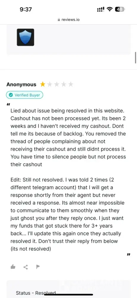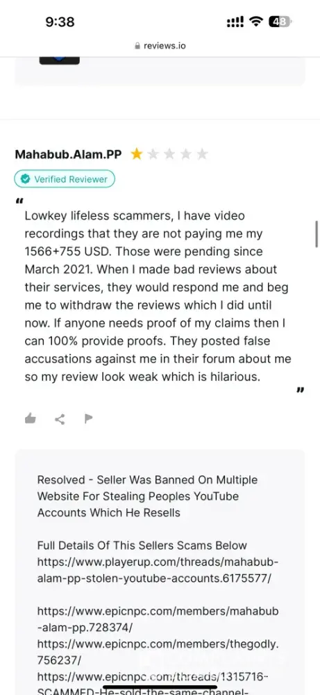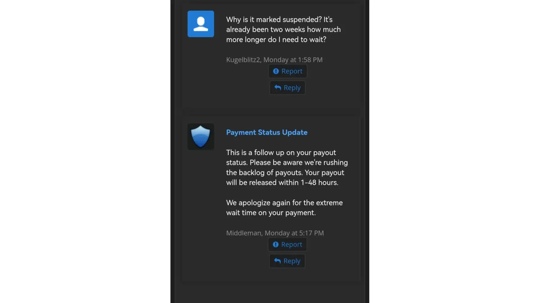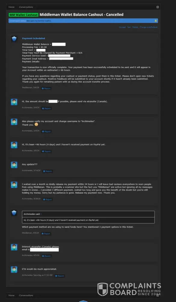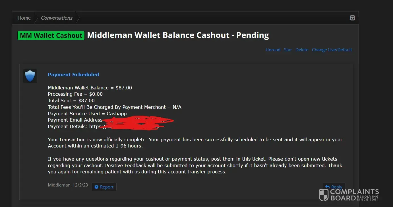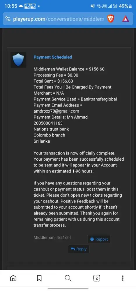 If you use Middleman services, they will waste your time, make your experience so miserable and you'll never get your money, ever! After selling my very old high quality Reddit account (+500k karma!) I have been waiting for over 2 months for them to process my payment. Initially I provided them with my PayPal information and ID, but after ignoring me for over a month, I provided 2 more payment options just in case they may have delays with PayPal. I kept asking for payment status about once a week (via PlayerUp pm, forums and Telegram) and didn't get a single response from Middleman or staff for weeks! The worse thing is "last seen 1min ago" every day I log in which means they are deliberately refusing to pay me, that and the fact they banned my posts on the forms without any feedback (my posts shows 0 visits and don't appear for me when logged out)... After I finally decided to kiss my money goodbye and wrote a bad review here, the Middleman messaged me immediately (like within 1min lol) on Telegram, he basically demanded that I delete the negative review in order to get my payment, and he made a bold claim that "my mixed payment options caused delays". Are you freaking kidding me? Still, I gave them the benefit of the doubt because 1) I need my large sum of money. 2) Middleman confirmed they finally have all needed information and that my payment shouldn't take more than 96 hours... Needless to say, that was a lie too and just an attempt to stall me even longer... And btw, the Middleman will reduce your payment again and again. If you sell an account at 1000$, the Middleman will offer you 700$ if you're lucky, and if he has to reissue you a new cashout link (which they did for me), they will reduce again to an amount they see fit... In conclusion, please don't make the same mistake as me and never give 2nd chances, they will only provide you with false hope and waste your time and energy for nothing... I logged in multiple times a day just to check if I got my payment and I was sad to see none... (Middleman, don't even attempt to fool me again into deleting this review, I won't! In fact I will write on 4-5 different places unless you give me my money, today! Also feel free to ban my account on the forum because guess what, I don't want to ever use it again!)