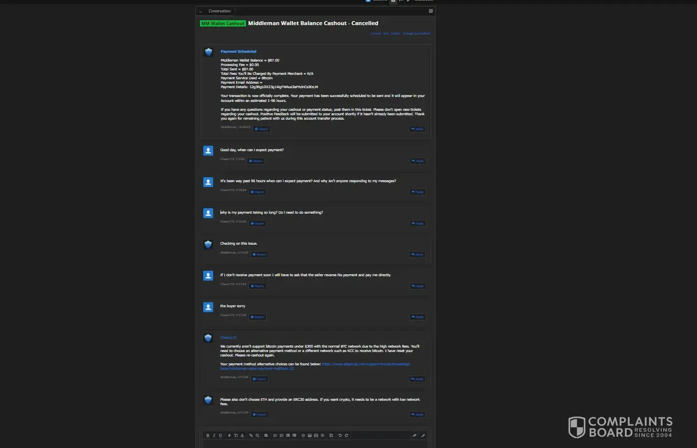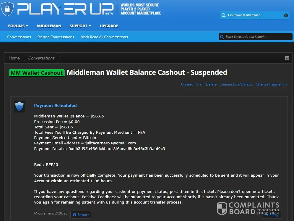 I was scammed by a middleman on PlayerUp for $2,300 in Bitcoin. I followed their checkout process step by step, sent the funds to the exact address shown on their payment page, and the transaction was successfully confirmed on the blockchain. After that, the problems started. They claimed that they never received the payment and that their system could...