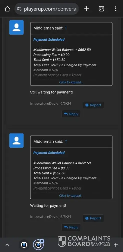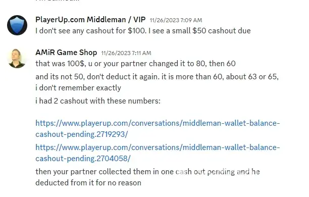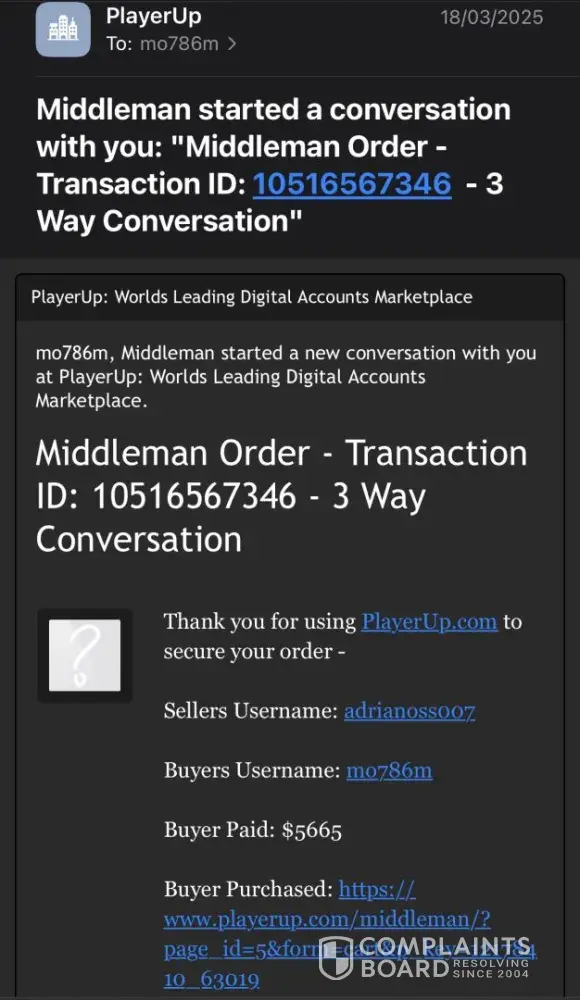 - March 2022 i sell an account for 1600$ on Playerup, Middleman must send me money after buyer have paid 1696$